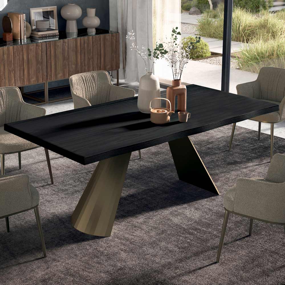 Mesa de salón fija en forma de barril, con tapa de madera chapada acabado roble carbón fósil , canto descortezado irregular , base de acero lacado champagne y pies regulables. La elección de materiales de primera calidad y la atención en la creación de cada detalle crean un producto de excelente calidad Made in Italy . Gracias a la forma de la base y a los acabados disponibles, esta mesa es protagonista de cualquier ambiente contract diario , convirtiéndose en una idea perfecta para todos aquellos que quieran darle a la estancia un toque elegante, suntuoso y único.