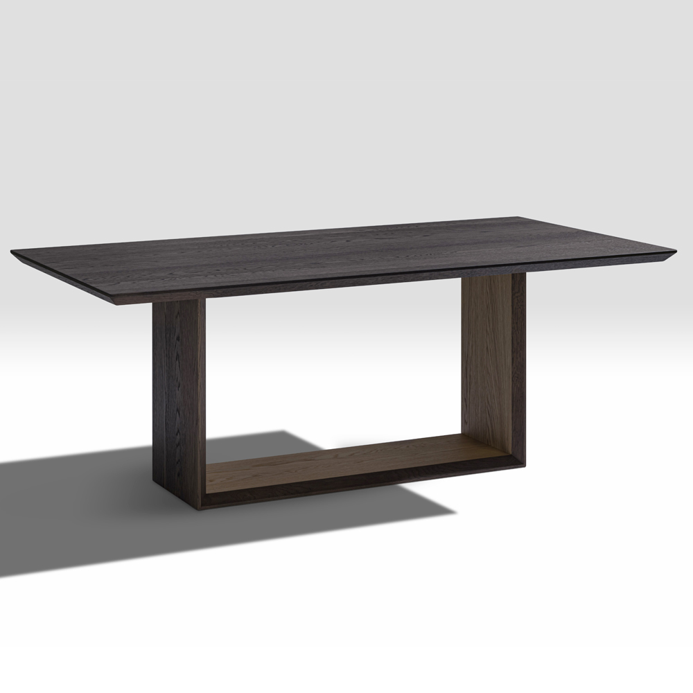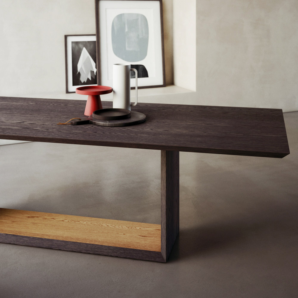 Mesa fija con tapa biselada de roble ahumado y base bicolor Made in Italy.