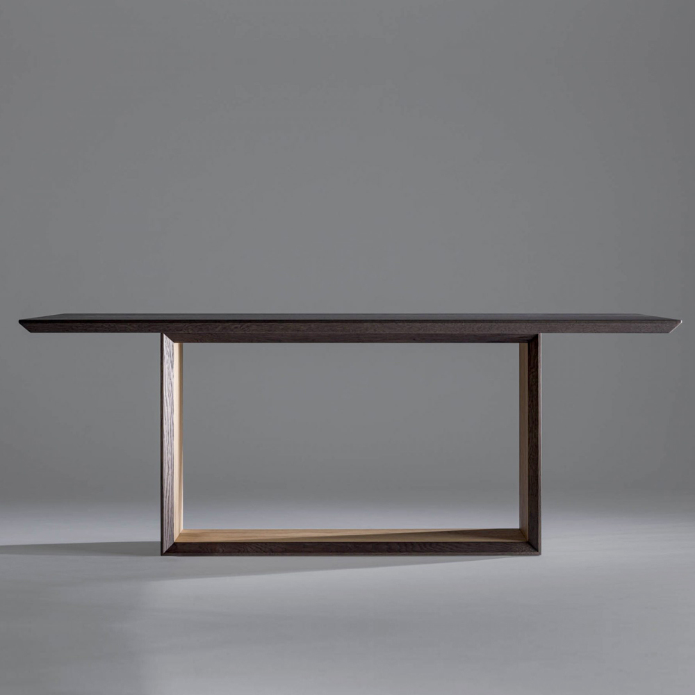 Mesa fija con tapa biselada chapada en aglomerado de chopo roble color humo.Base biselada enchapa bicolor, exterior en roble ahumado e interior en roble natural.