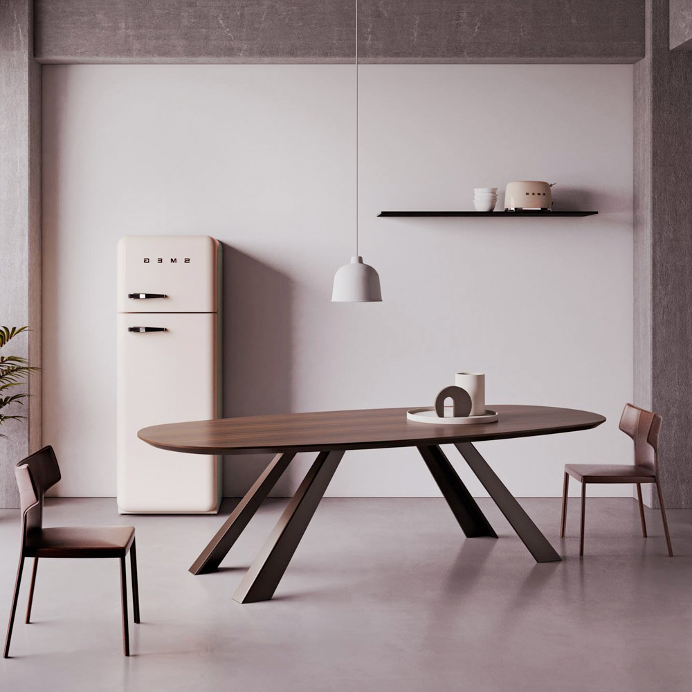 Mesa fija con tapa elíptica y borde biselado Made in Italy.