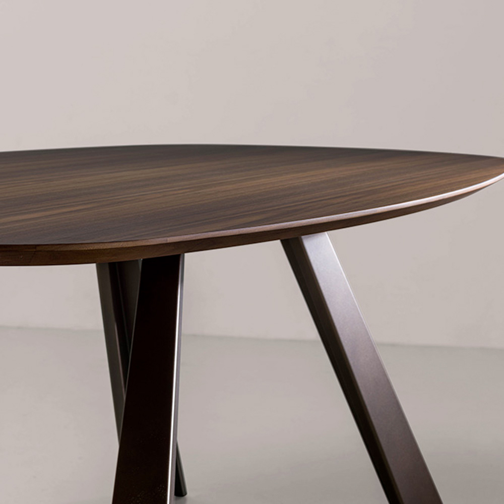 Mesa fija con tapa elíptica biselada de block chapado en eucalipto y patas de metal pintado acabado bronce.Borde superiorbiselado Dimensiones Al 77 cm, espesor 3 cm.