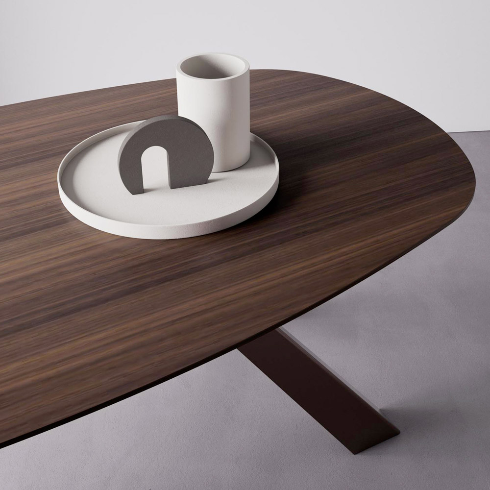 La mesa está conformada por formas futuristas, que dan luz a la esencia, dotándola de líneas y perspectivas distintivas. La robustez de los materiales se traduce en un impulso creativo forjado por hábiles manos italianas, alcanzando nuevos objetivos cualitativos y estéticos. El mobiliario se convierte en un medio para conseguir el espacio personal ideal.