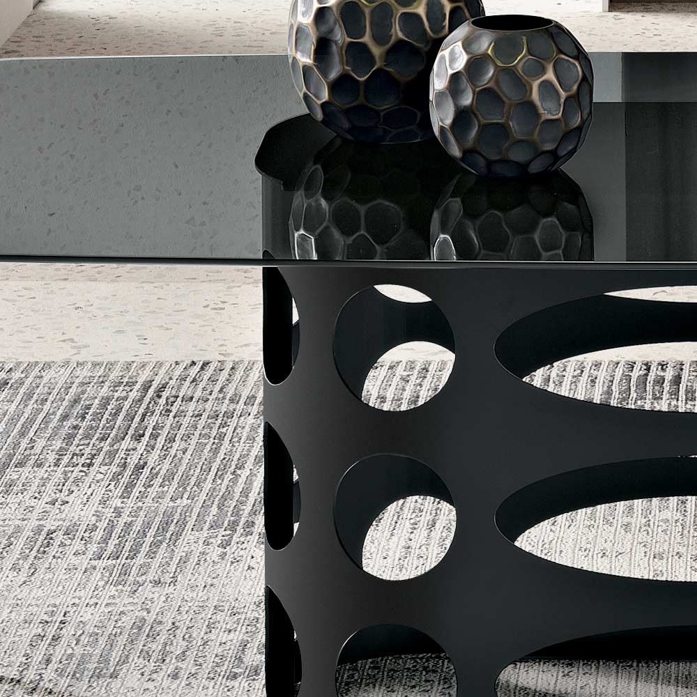 La superficie lisa de cristal ahumado aporta luminosidad y ligereza visual a la estructura, realzando el diseño contemporáneo de la mesa. La transparencia del cristal resalta la base decorativa, convirtiéndola en un elemento de diseño realmente llamativo.