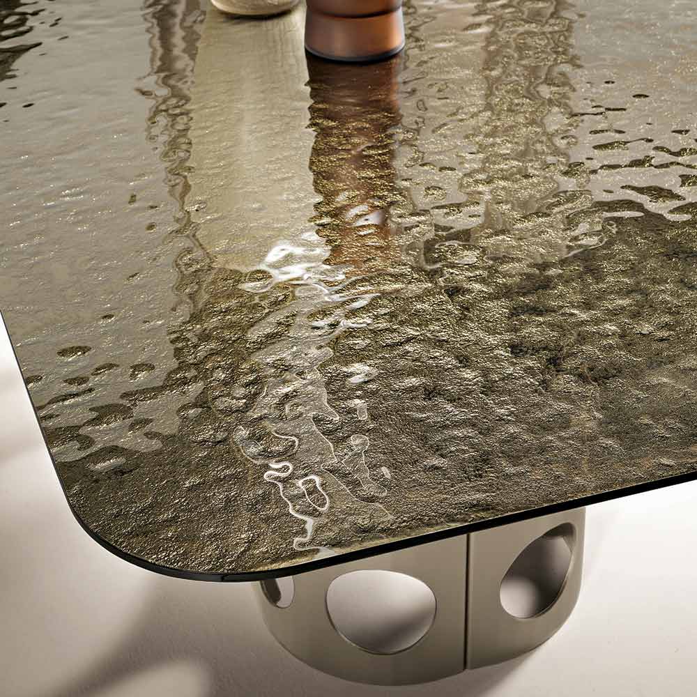 La superficie de cristal martillado aporta profundidad y personalidad a la mesa gracias a su singular acabado texturizado que refleja la luz de forma irregular, creando impactantes efectos visuales. Este proceso dota a cada superficie de dinamismo y sofisticación, realzando el diseño contemporáneo del producto.
