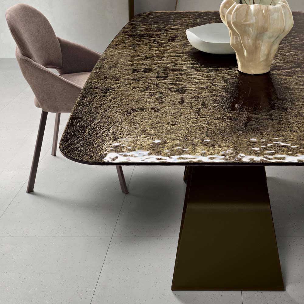 La tapa de cristal martillado aporta personalidad a la mesa gracias a su singular acabado texturizado que refleja la luz de forma irregular, creando sugerentes juegos de reflejos y profundidad. Este acabado realza la luminosidad del cristal y confiere a la tapa un aspecto elegante y sofisticado.