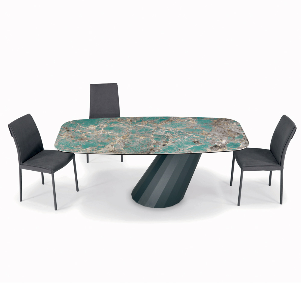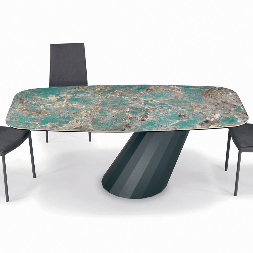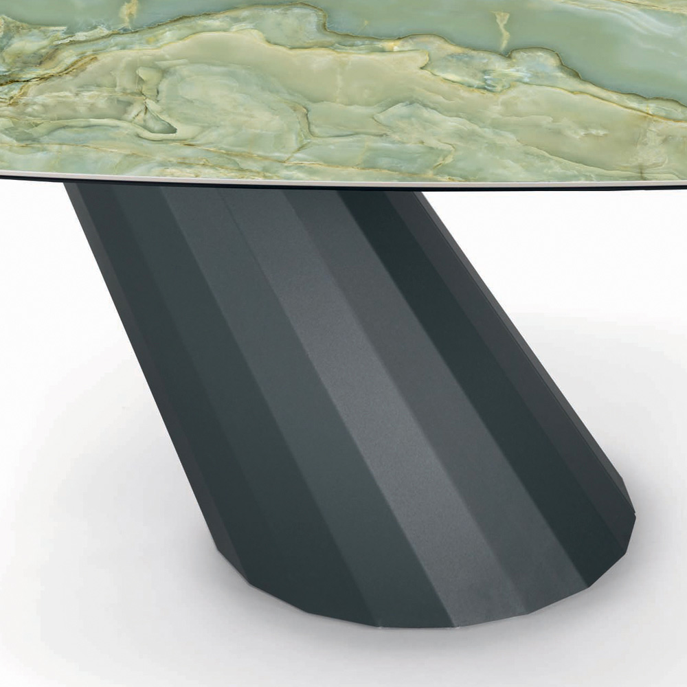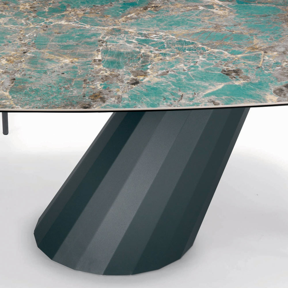 Mesa de salón fija en forma de barril con tapa de cerámica , borde biselado a 45° , base de acero lacado grafito y pies regulables Made in Italy. Este producto desprende gran elegancia y se convierte en protagonista de cualquier ambiente . El refinamiento de la forma de la base combinado con el acabado del tablero elegido crea una mesa única, de gran impacto visual, que decora con gusto y refinamiento los ambientes cotidianos y contract. La elección de materiales de primera calidad y la atención en la creación de cada detalle crean un producto de excelente calidad Made in Italy.