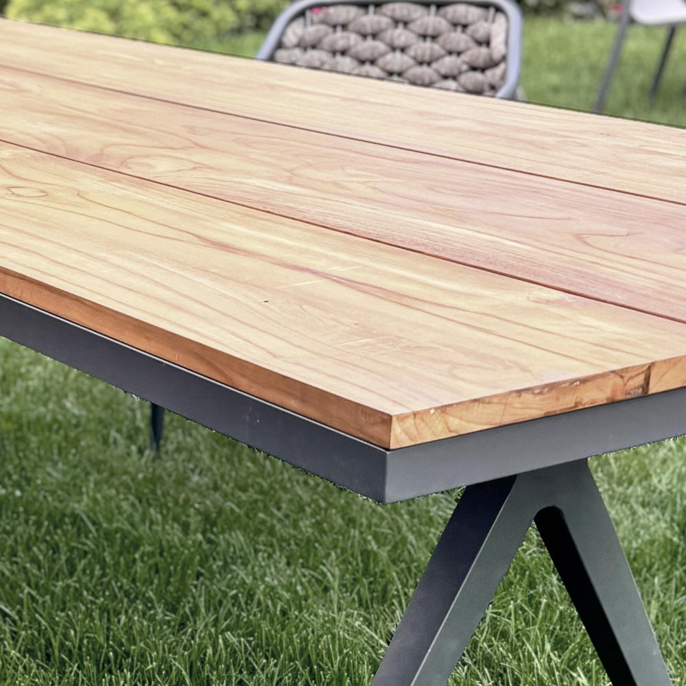 El verdadero protagonista es el tablero de listones de teca maciza , una elección de valor artesanal que le otorga a la mesa una elegancia atemporal. La teca, conocida por sus extraordinarias propiedades de resistencia y durabilidad , le confiere un aspecto cálido y acogedor, perfecto para ambientes exteriores refinados.