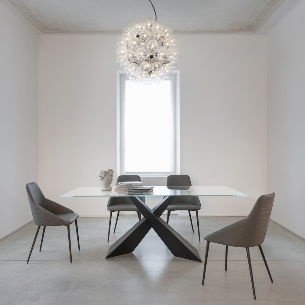 El tablero de cristal templado transparente aporta ligereza visual y hace que la mesa sea perfecta para realzar cualquier tipo de ambiente, desde el más clásico al más contemporáneo.