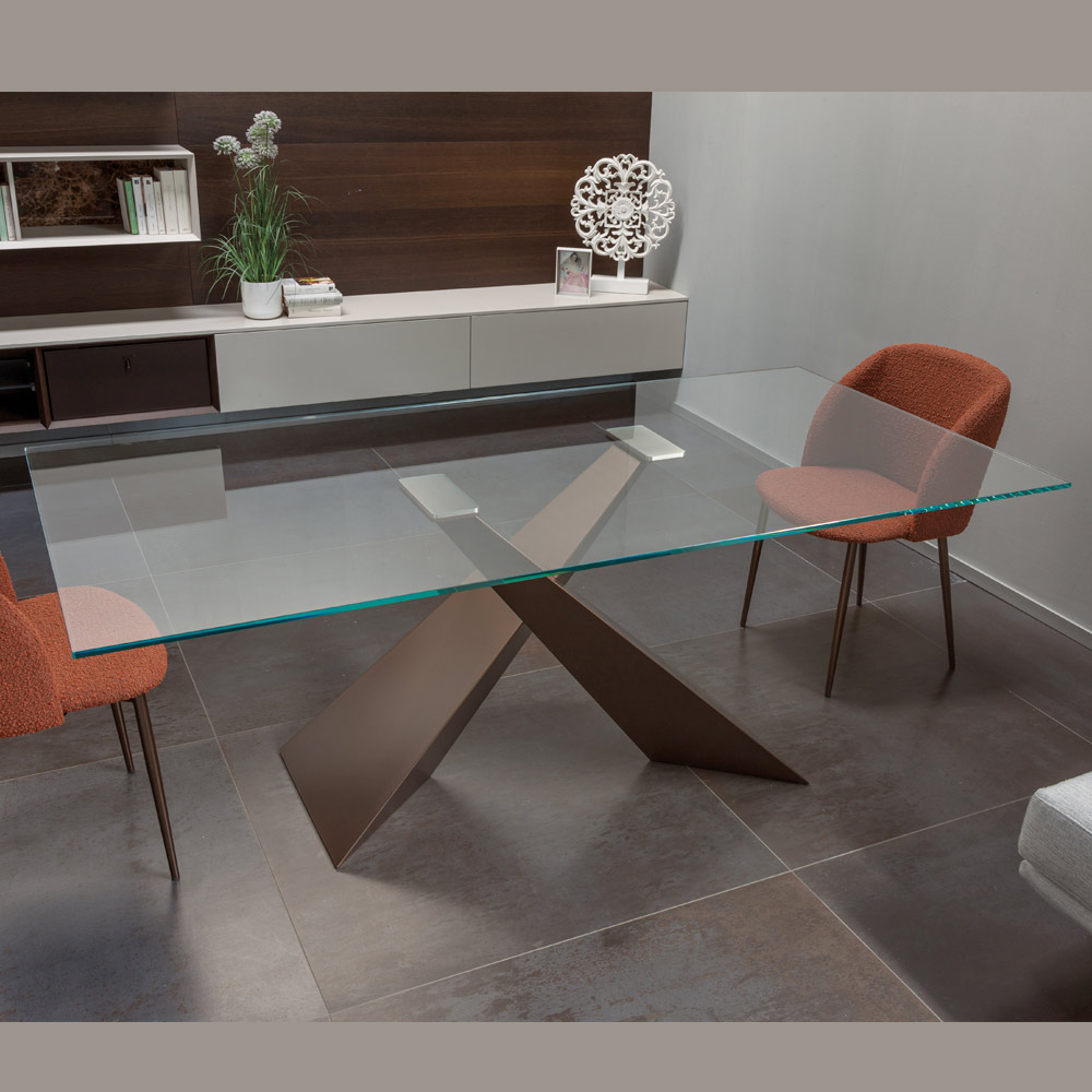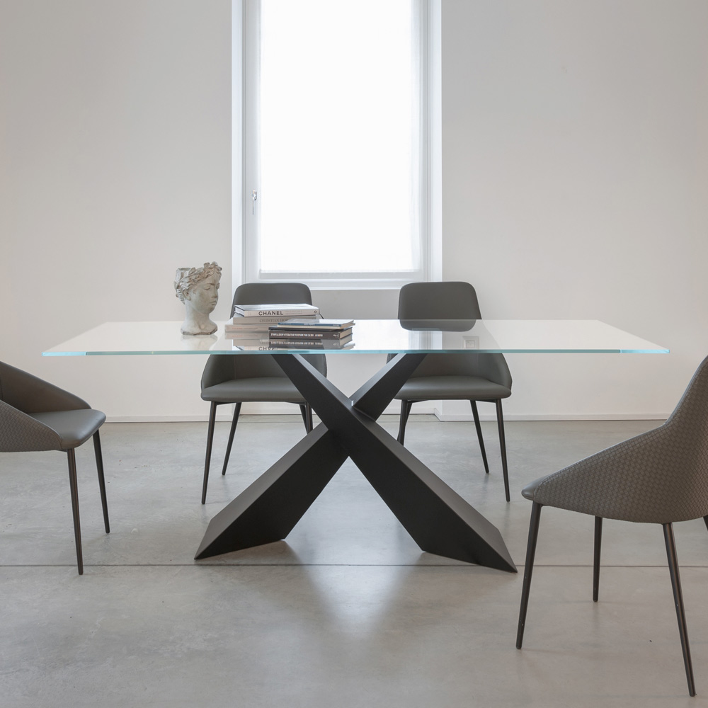 La protagonista absoluta es la base cruzada de metal pintado , con un diseño geométrico y dinámico. Las líneas definidas crean un efecto escultórico y arquitectónico , transformando la mesa en un auténtico elemento de decoración.