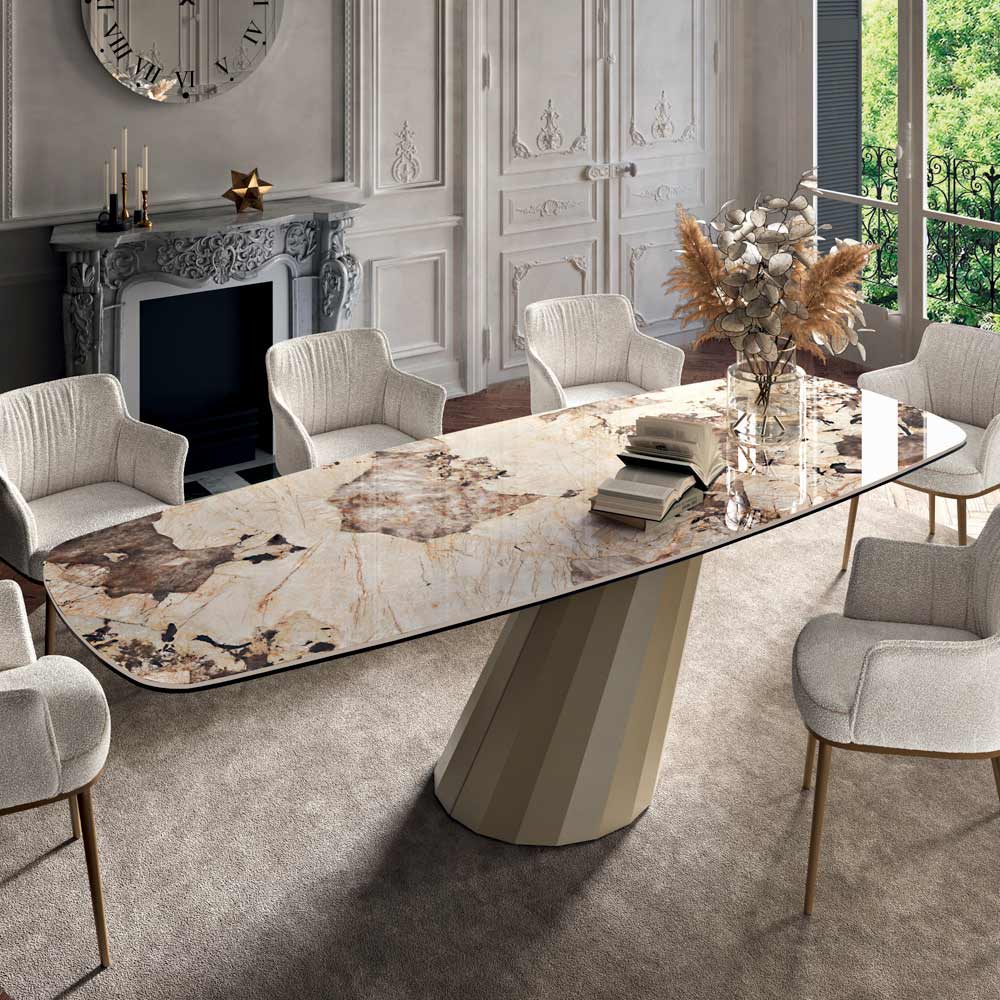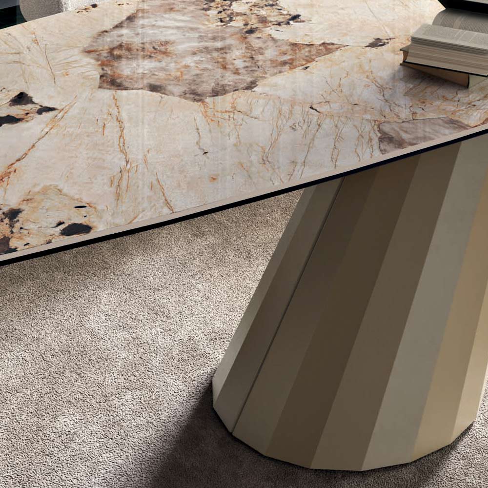 Mesa de salón fija en forma de barril con tapa de cerámica , borde biselado a 45° , base de acero lacado champán y pies regulables Made in Italy. Este producto desprende gran elegancia y se convierte en protagonista de cualquier ambiente . El refinamiento de la forma de la base combinado con el acabado del tablero elegido crea una mesa única, de gran impacto visual, que decora con gusto y refinamiento los ambientes cotidianos y contract. La elección de materiales de primera calidad y la atención en la creación de cada detalle crean un producto de excelente calidad Made in Italy.