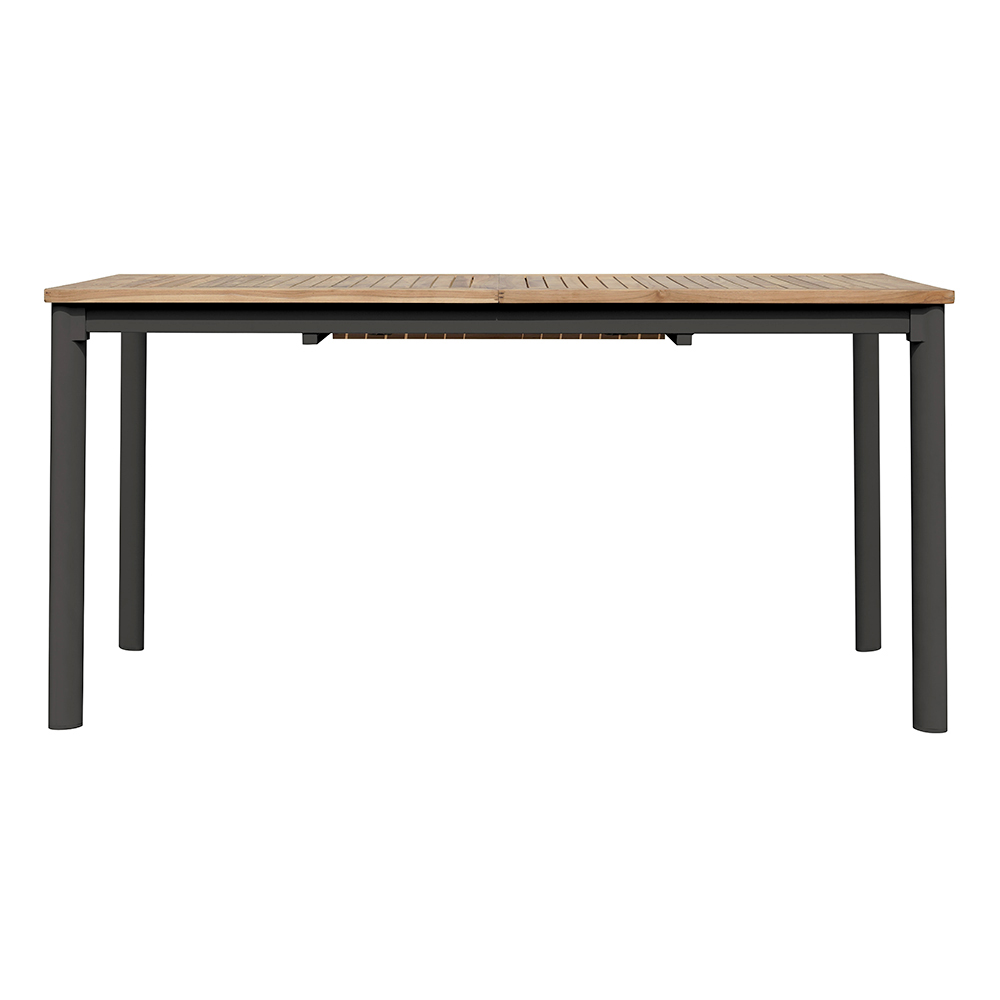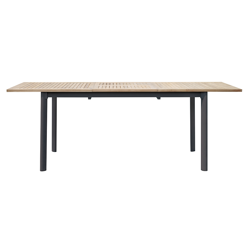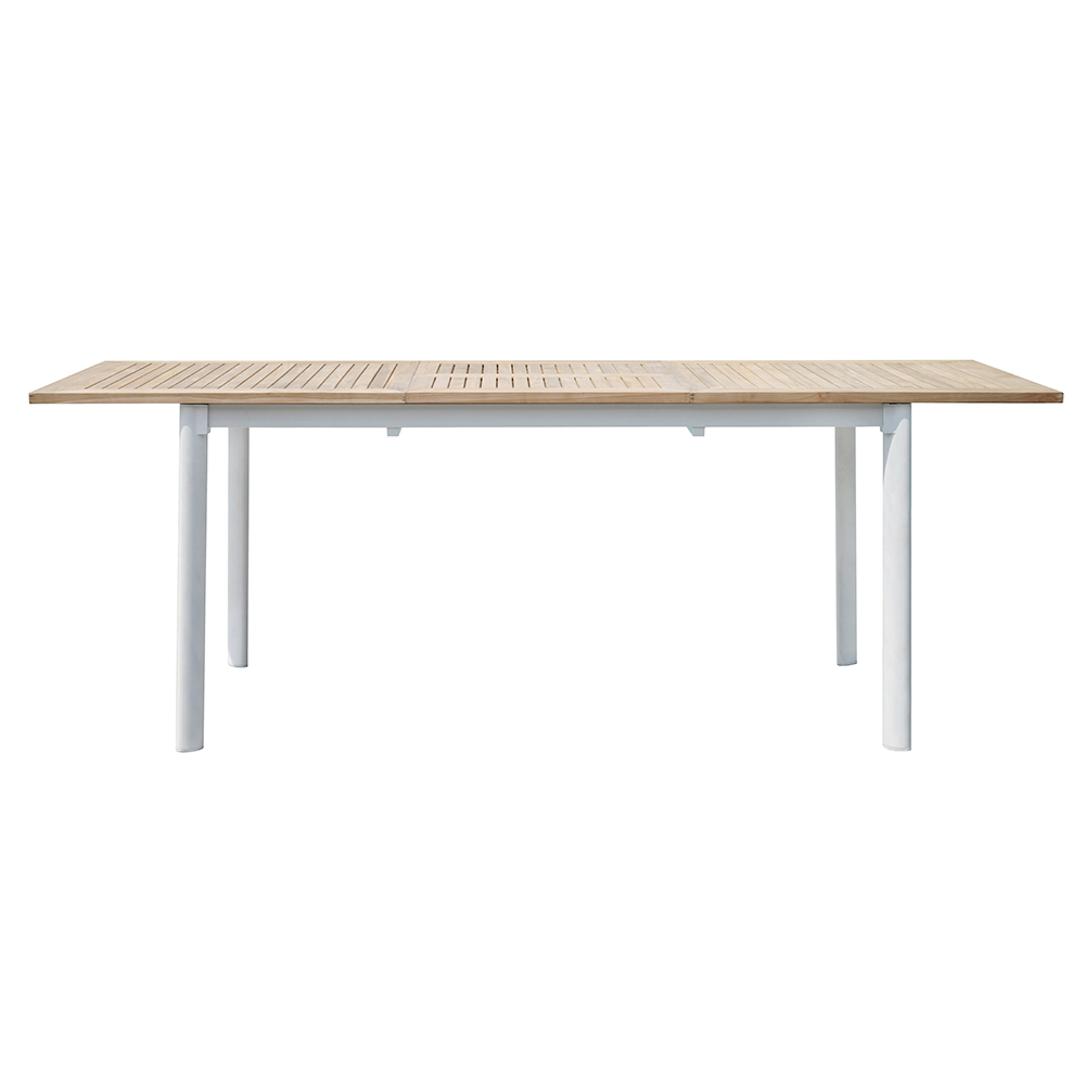 Mesa extensible para el jardín fabricada en madera de teca y aluminio.
