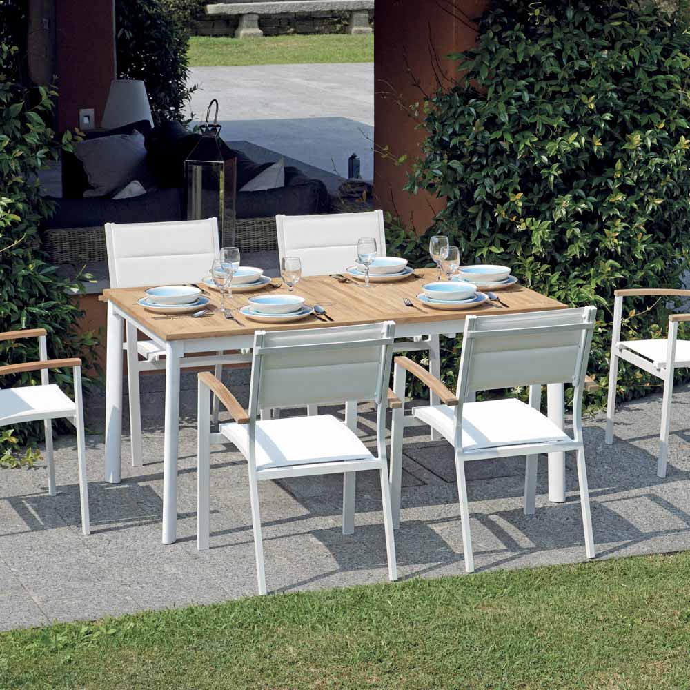 La teca está clasificada como la madera más valiosa disponible para muebles de exterior. Es extremadamente duradero, estable, resistente a los agentes atmosféricos, hongos, ataques de parásitos e insectos. Contiene altos niveles de aceites naturales que lo hacen resistente y limitan la absorción de humedad. Con el tiempo, los muebles de teca expuestos al sol, la lluvia, la humedad, etc. generalmente tienden a adquirir un color gris plateado: esto se debe a un proceso de oxidación superficial que protege naturalmente la madera. Este proceso es puramente estético y no daña la estructura ni la calidad de la madera. La aparición de aceite en la superficie de los muebles de teca es un proceso natural: el aceite puede filtrarse durante los primeros meses, de forma más o menos constante dependiendo del entorno en el que se coloquen los muebles. Los aceites naturales que se encuentran en la teca son los que la convierten en la mejor madera para muebles de exterior.