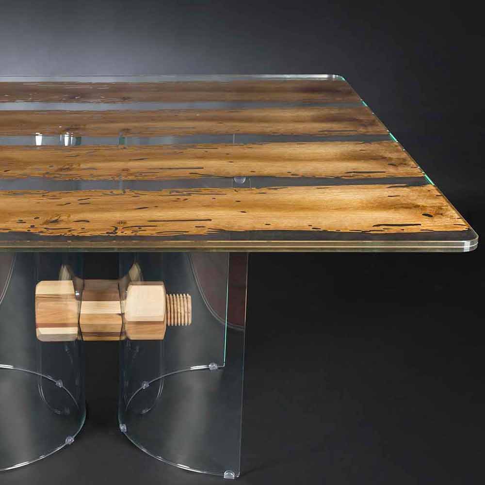 Mesa sencilla y elegante, de forma cuadrada y de diseño único e inimitable, adaptable a todo tipo de mobiliario. La madera de las "Briccole" y el cristal se funden en un abrazo cálido e indisoluble. La peculiaridad esencial de la mesa reside en su base de cristal arqueado, conectado por un tornillo de diseño y un dado, en diferentes tipos de madera de renombrada ebanistería artesanal.