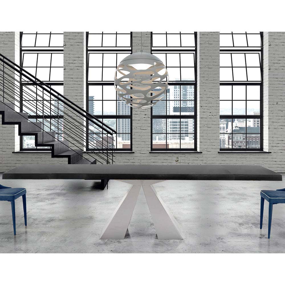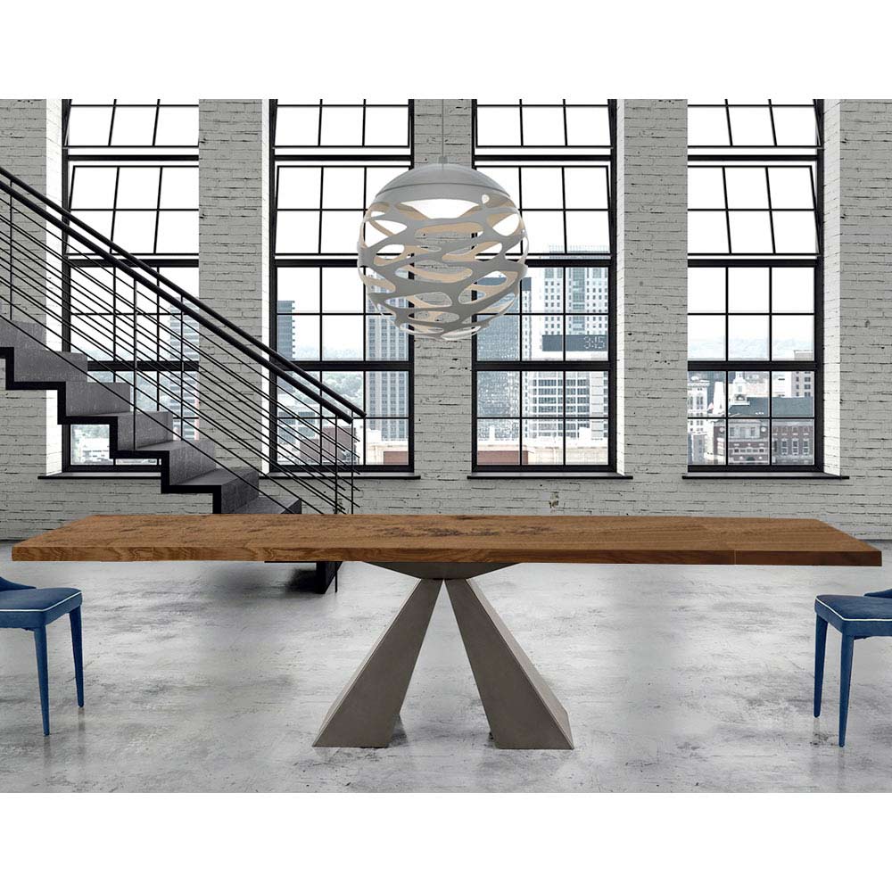 La mesa de comedor extensible Dalmata se caracteriza por un diseño siempre refinado e innovador, perfecto para integrarse en tu vida diaria. Hecho a mano en Italia con materiales de excelente calidad y 100% made in Italy. Compuesto por tapa de madera contrachapada con canto descortezado irregular.y base en acero lacado visón o blanco.
