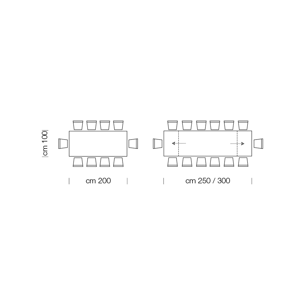 L 200 (300) x P 100 x H 76,5 cm 14 plazas extensible con dos extensiones externas de 50 cm.