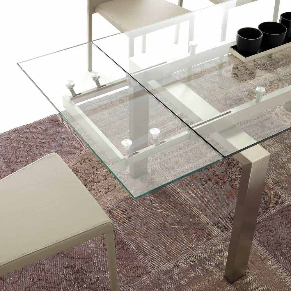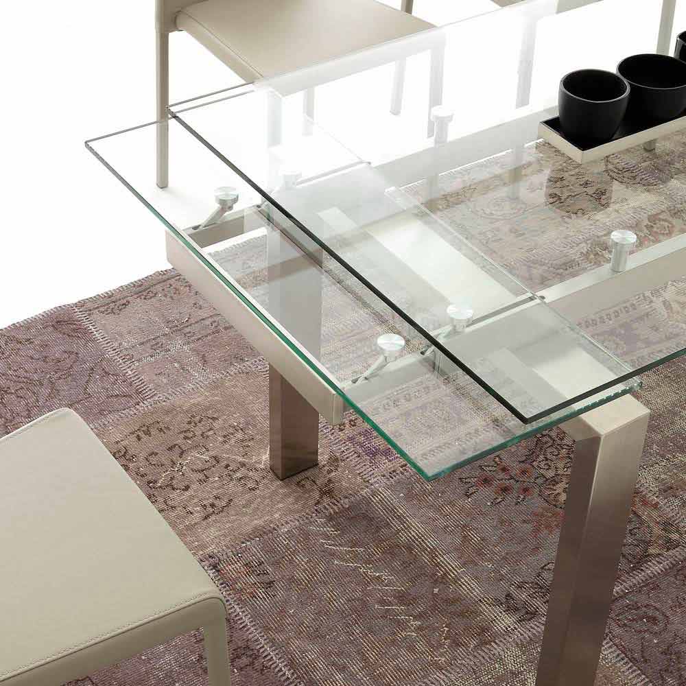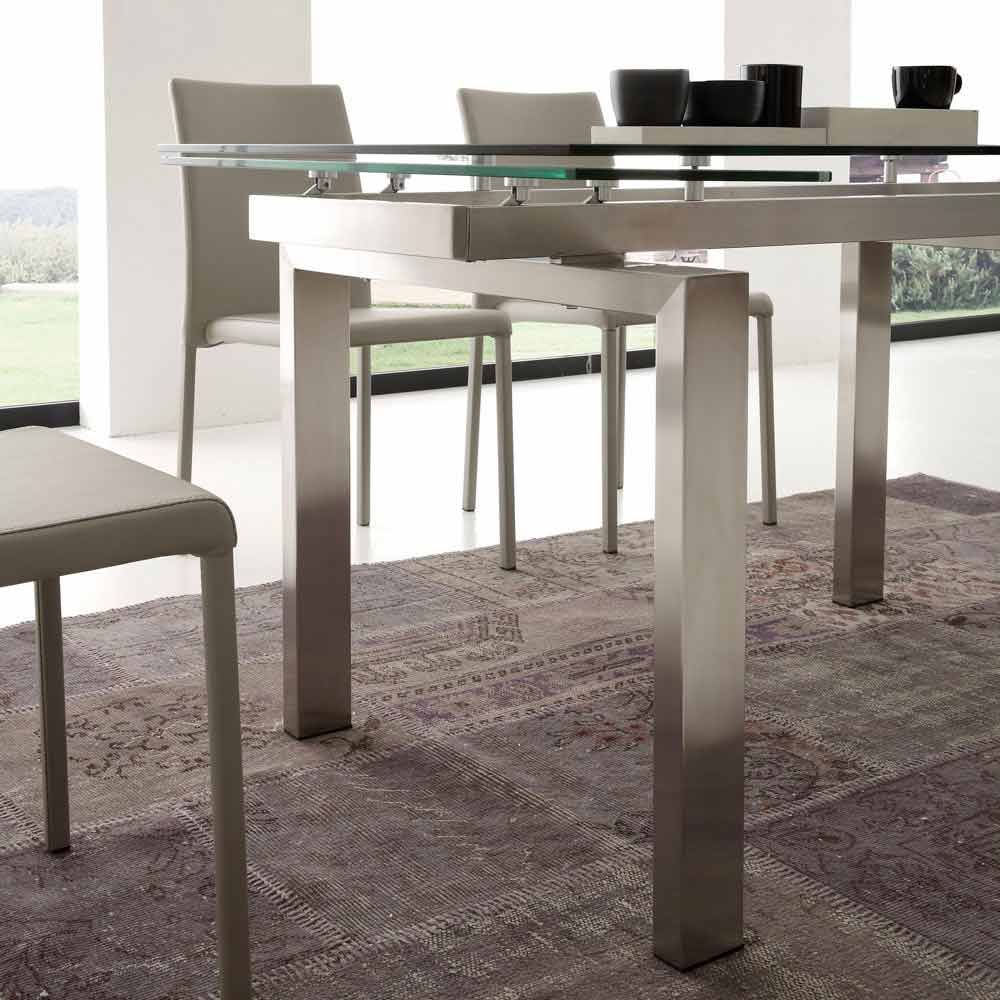Se compone de una estructura de acero satinado cepillado y de un tablero sencillo y elegante a la vez de cristal templado transparente (10 mm).