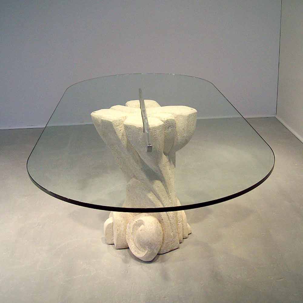 Mesa de comedor ovalada, realizada enteramente en Italia, con base central de piedra natural de Vicenza, esculpida manualmente directamende del bloque de piedra.