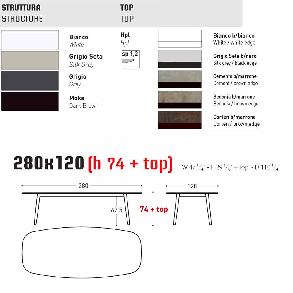 Ellisse es una mesa fija para exteriores con una estructura de aluminio con recubrimiento de polvo para elegir entre cuatro colores: blanco, gris seda, gris y moka ; con tapa en HPL (sp 1.2) en acabado: borde negro gris seda, borde negro blanco, borde negro antracita, borde blanco blanco, borde marrón cemento, borde marrón bedonia, borde marrón corten ; o con una tapa de cerámica martillada (sp 1.2) en el acabado: cal blanca y pórfido gris .