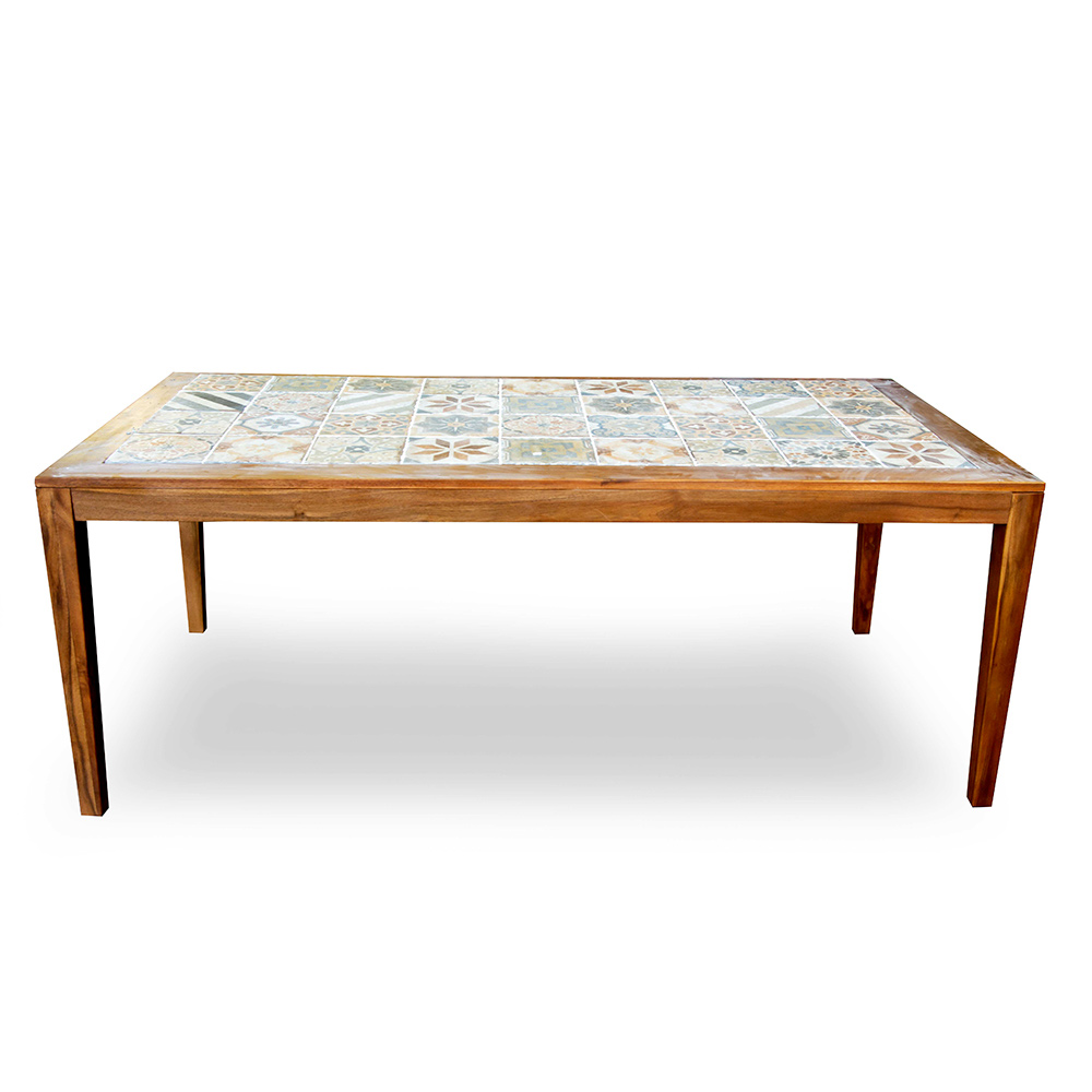 Descubre la mesa de comedor que combina elegancia rústica y arte tradicional en un exclusivo mueble. Esta hermosa mesa cuenta con una tapa de cerámica decorada, armoniosamente colocada en una sólida estructura de madera . Cada baldosa se selecciona cuidadosamente para crear un mosaico que evoca las tradiciones artesanales, convirtiéndola en una pieza única y fascinante.