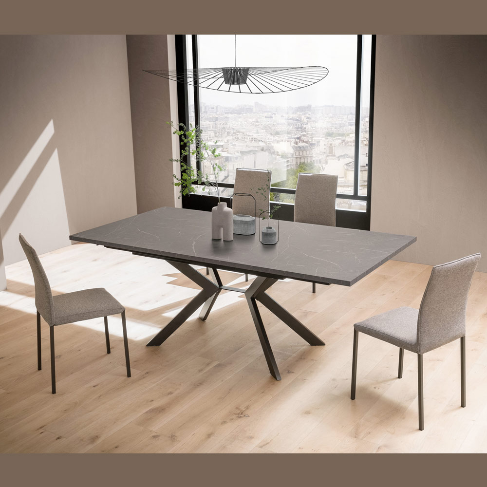 La base, de metal pintado y con un diseño geométrico cruzado, ofrece estabilidad y un toque escultural que no pasa desapercibido. Una solución de mobiliario perfecta para comedores, espacios abiertos o entornos contract con un estilo refinado.