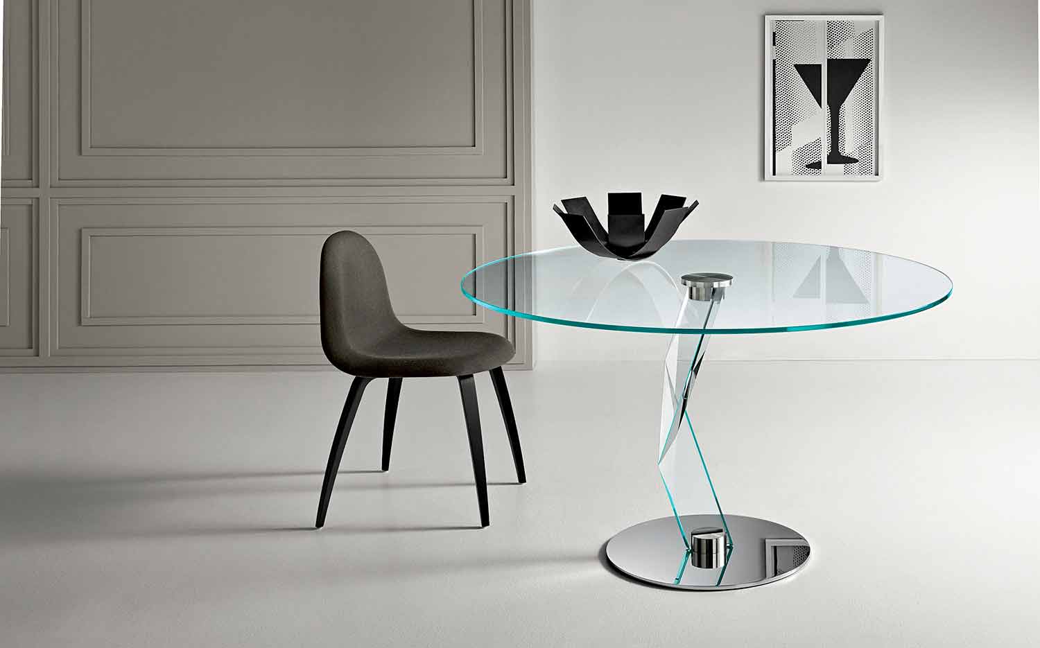 Compuesto por una tapa de vidrio extra transparente (12 mm de espesor) que contrasta con una pata central en vidrio extra claro (30 mm de espesor) que descansa sobre una base de metal cromado.