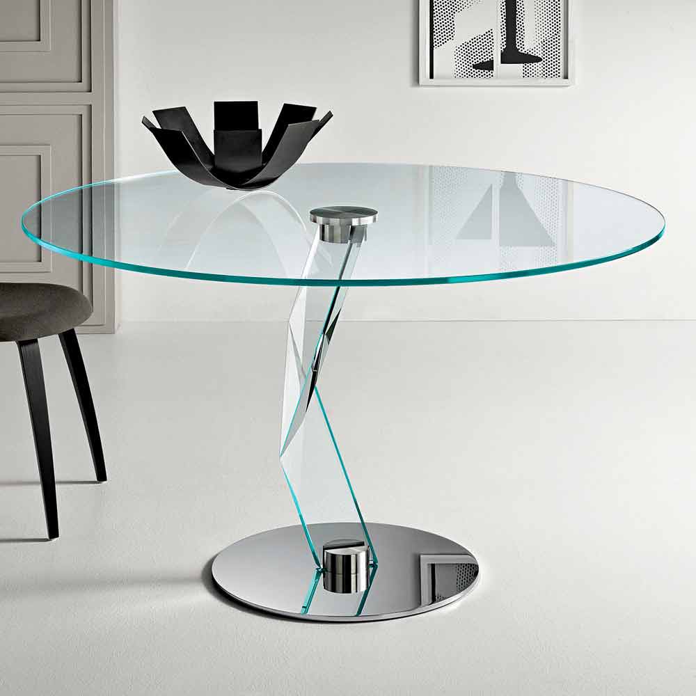 Mesa de cocina redonda con sobre de cristal extra claro y cristal extra claro y base de metal cromado de diseño moderno, hecho en Italia.