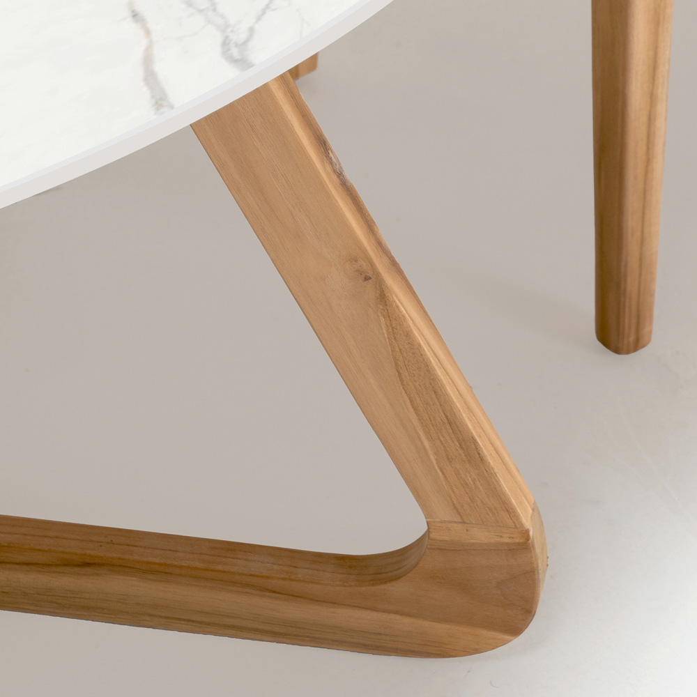 Mesa de exterior realizada con base en madera maciza de teca natural (35 mm de espesor), tablero en cerámica gres infinity (12 mm de espesor) con acabado mate Calacatta Oro y subestructura en contrachapado marino Okumé , íntegramente Made in Italy.