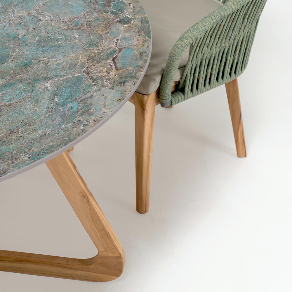 Mesa de exterior realizada con base de madera maciza de teca natural (35 mm de espesor), tablero cerámico infinity gres (12 mm de espesor) con acabado Santos brillante y subestructura en contrachapado marino Okumé , íntegramente Made in Italy.