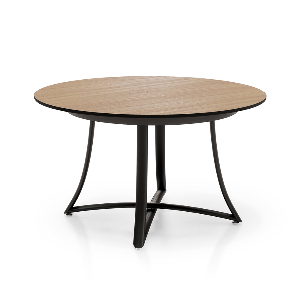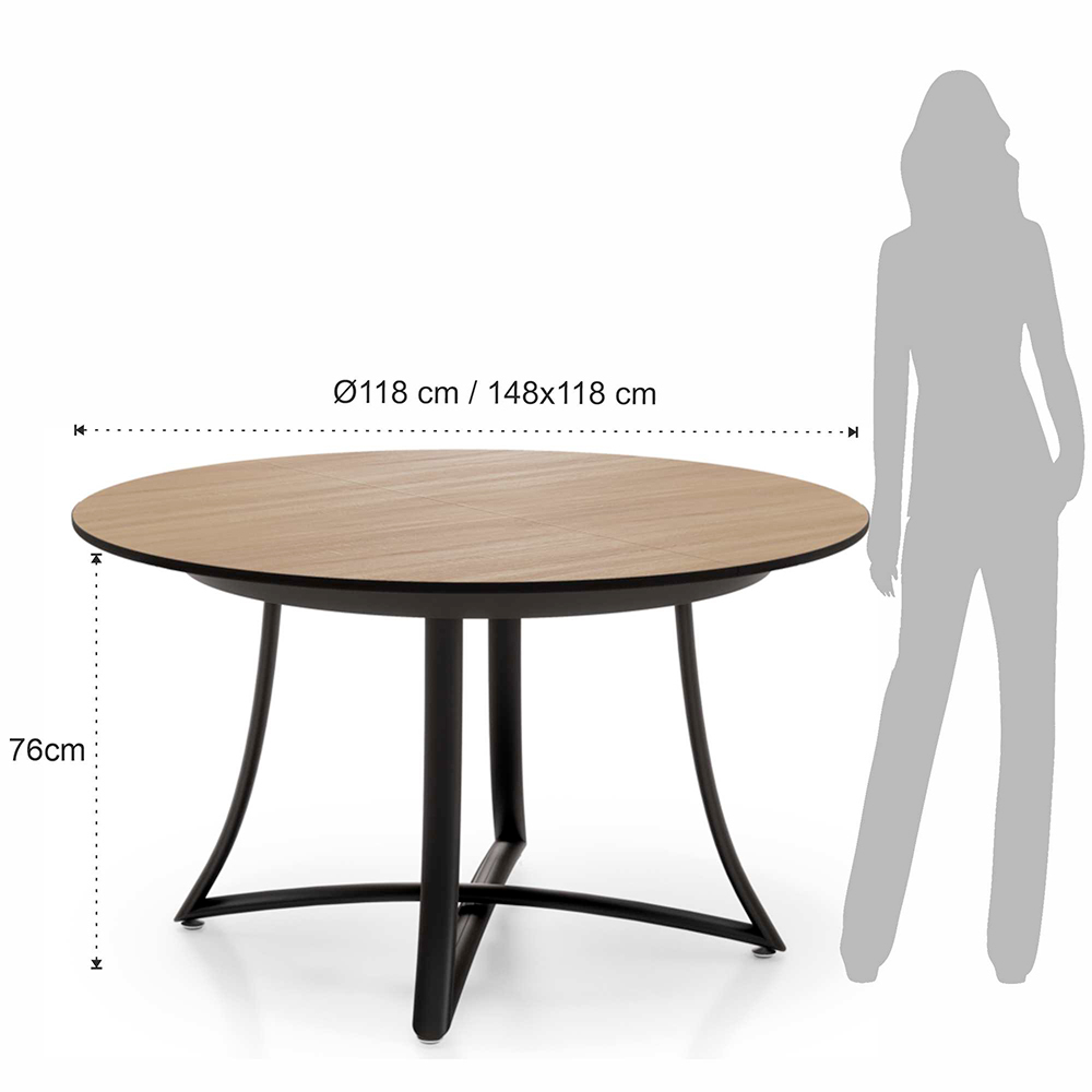 Esta mesa redonda extensible es un ejemplo perfecto de diseño moderno que combina funcionalidad y estilo. Con un tablero de madera, esta mesa transmite un ambiente cálido y acogedor, mientras que la base de metal negro ofrece un fuerte contraste visual que añade un toque de elegancia contemporánea al conjunto.