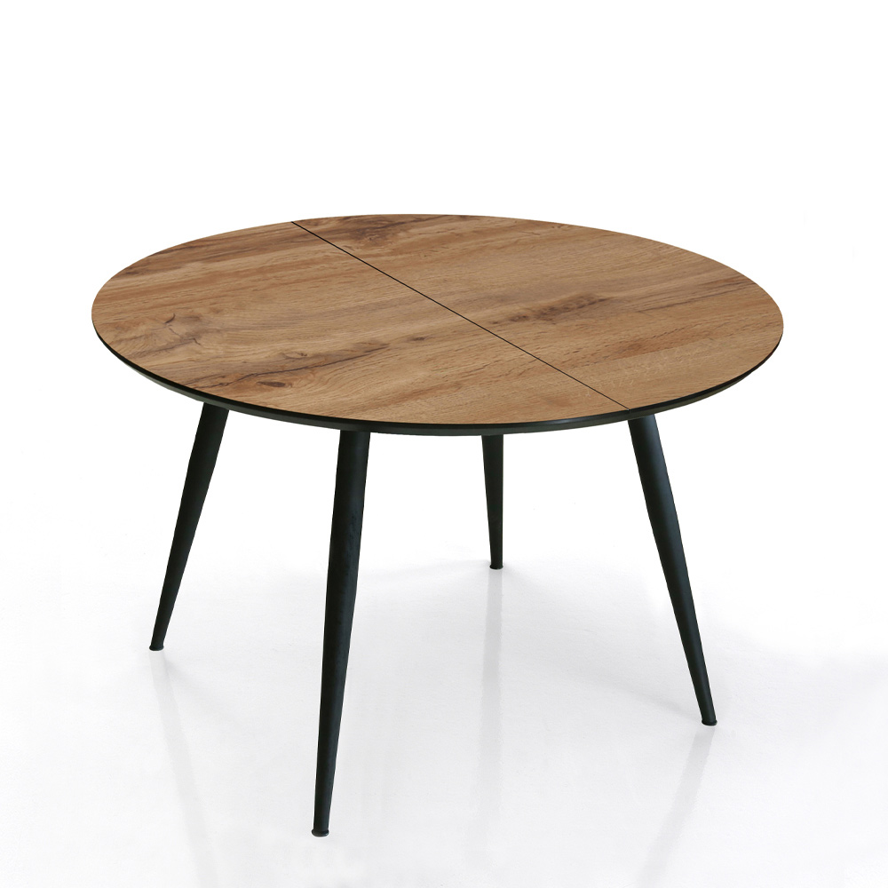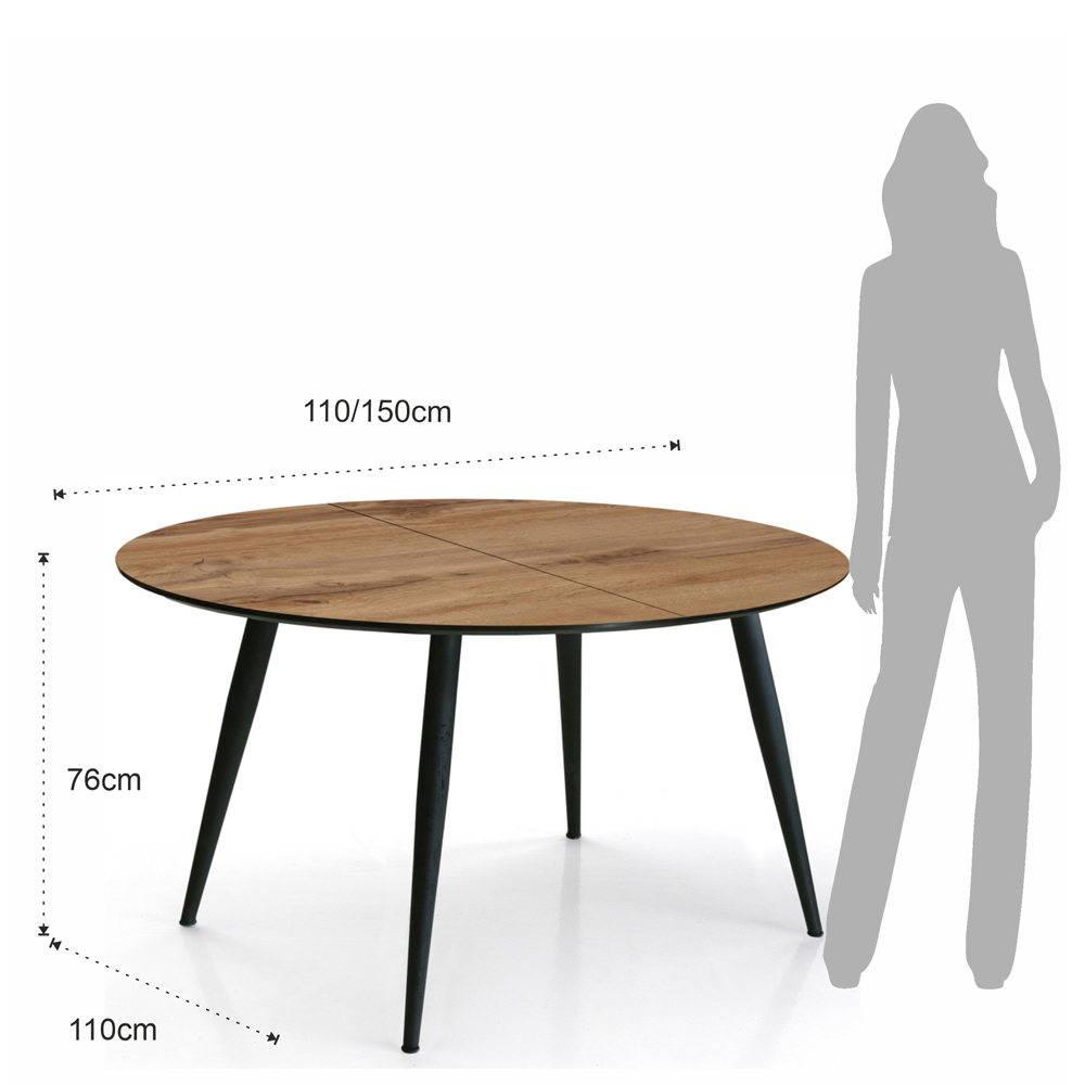 Mesa de interior con tapa fabricada en MDF grueso. 25 mm. revestido de melamina acabado nogal claro , base de acero pintado negro mate y extensión colocada íntegramente debajo del tablero. Este producto es la idea perfecta para todos aquellos que quieran dar un toque de modernidad y frescura al ambiente, ya sea un salón, una cocina o un ambiente contract. Los materiales elegidos para la construcción son de la más alta calidad para garantizar al cliente una mesa no sólo bella a la vista sino también funcional y resistente , que libera toda la artesanía de la.