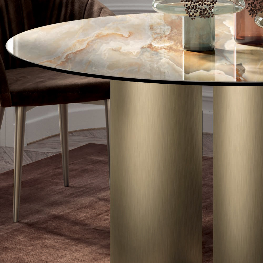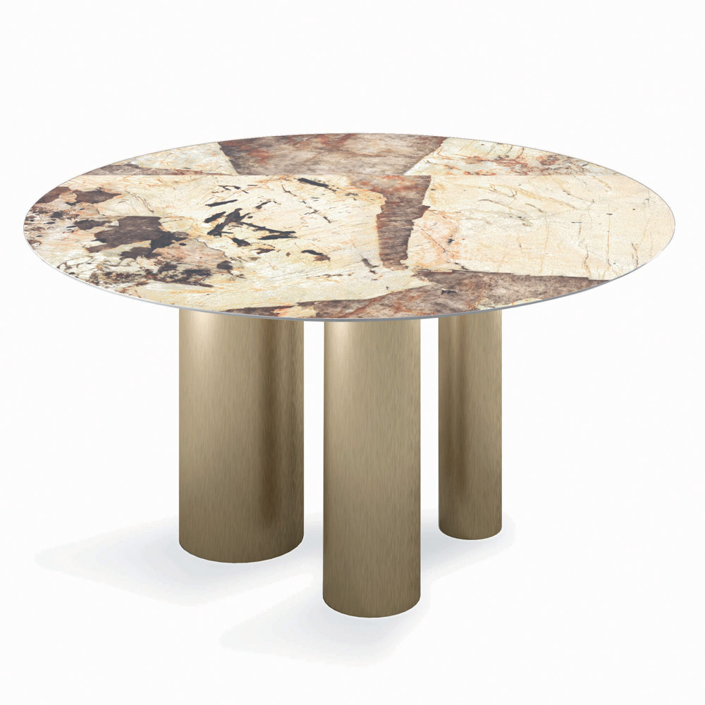 Mesa de salón fija redonda con tapa de cerámica , canto biselado a 45° , base de acero lacado champagne y pies regulables. El elemento característico de este producto es la base formada por 3 cilindros de diferentes tamaños que le confieren una elegancia y refinamiento únicos . Esta mesa puede completar y personalizar cualquier ambiente cotidiano y contract, respondiendo mejor a las más diversas necesidades de diseño. Está fabricado íntegramente en Italia eligiendo materiales de primera calidad y prestando atención a cada detalle.