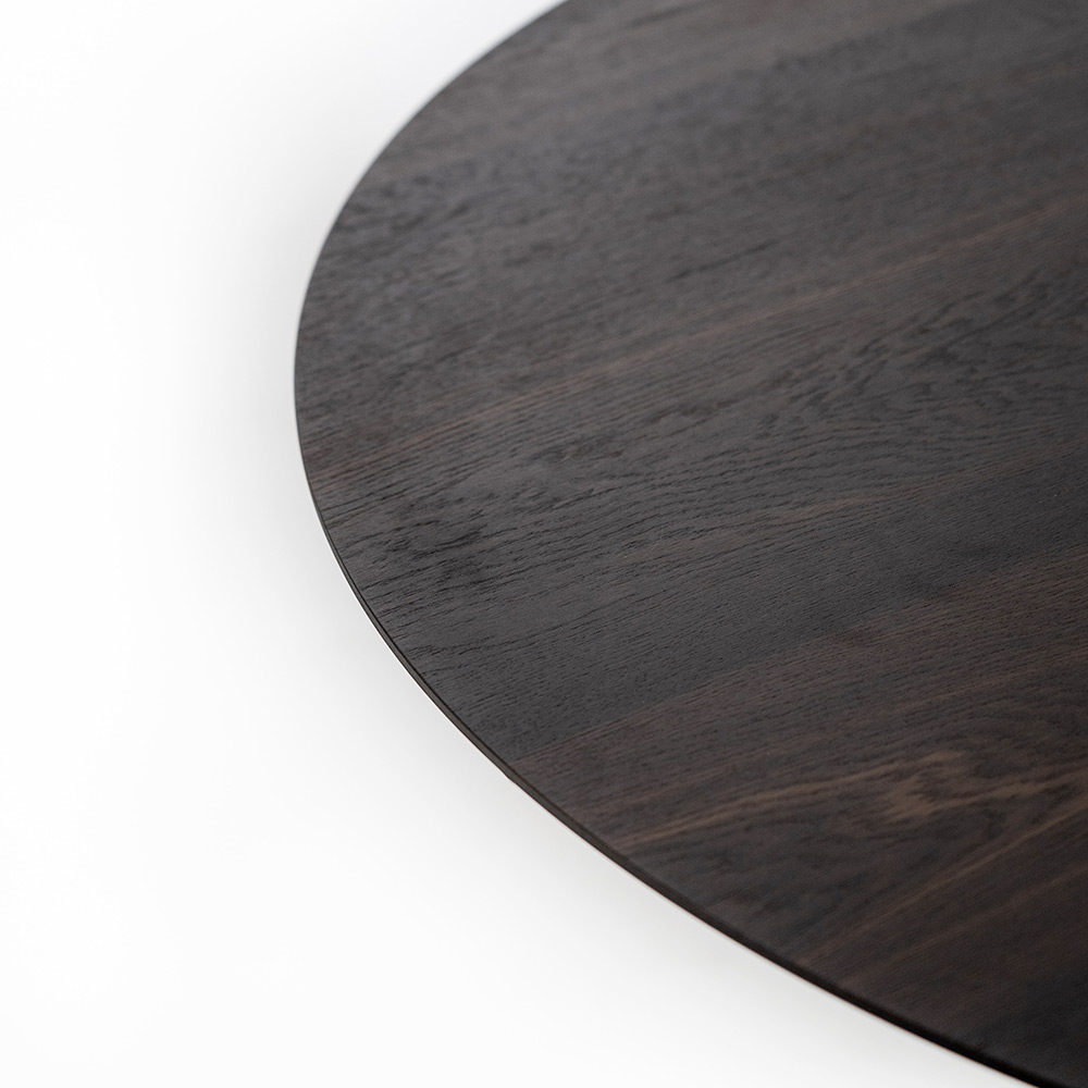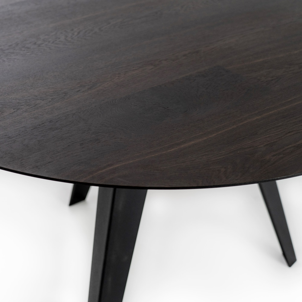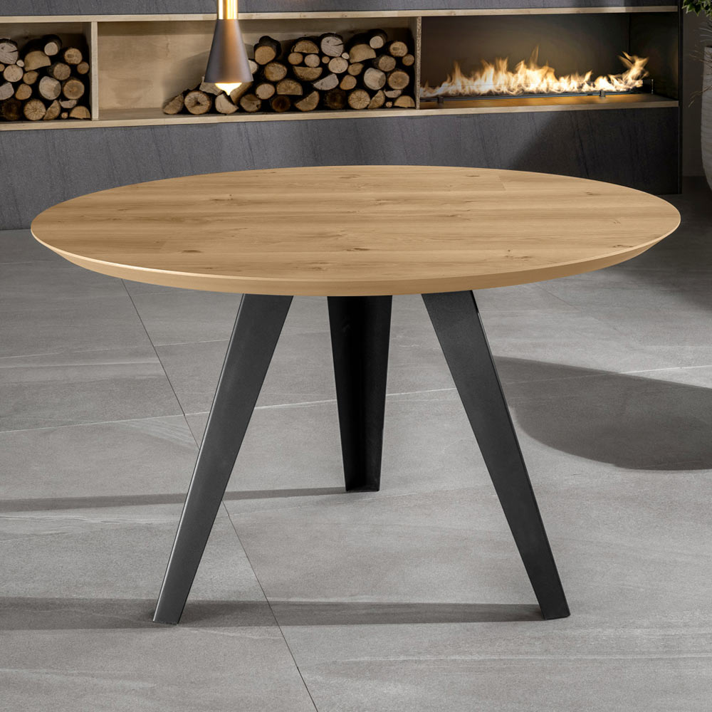 Mesa de salón redonda con tapa chapada en roble , patas de metal.