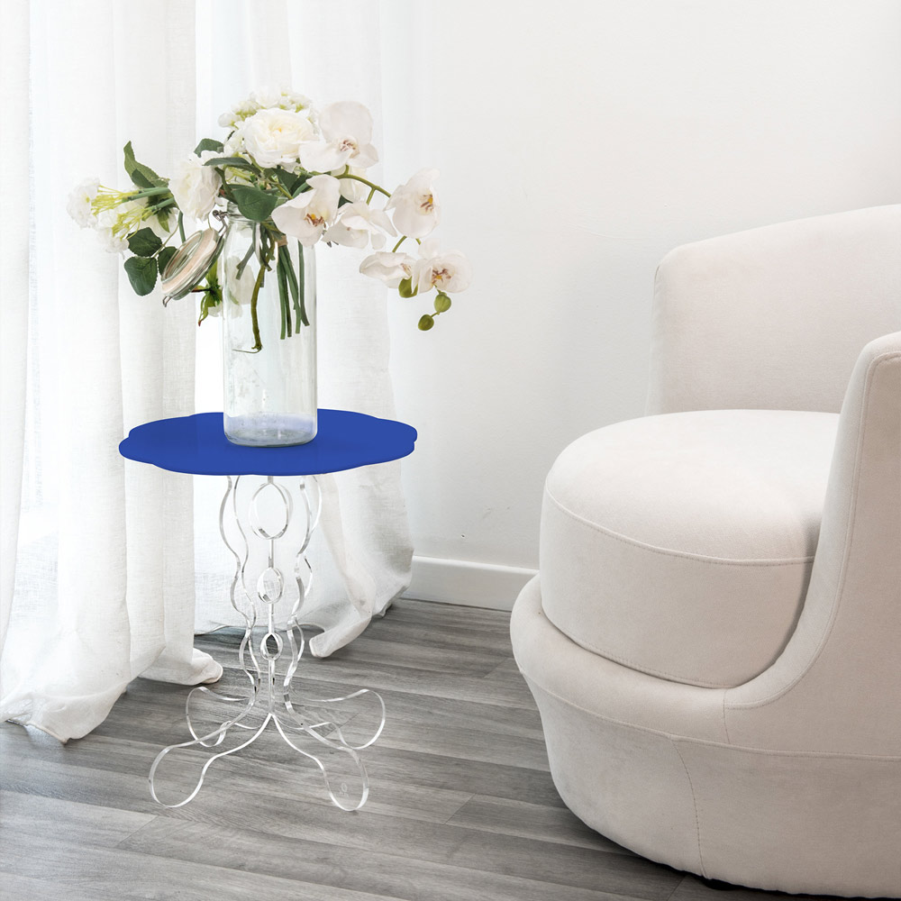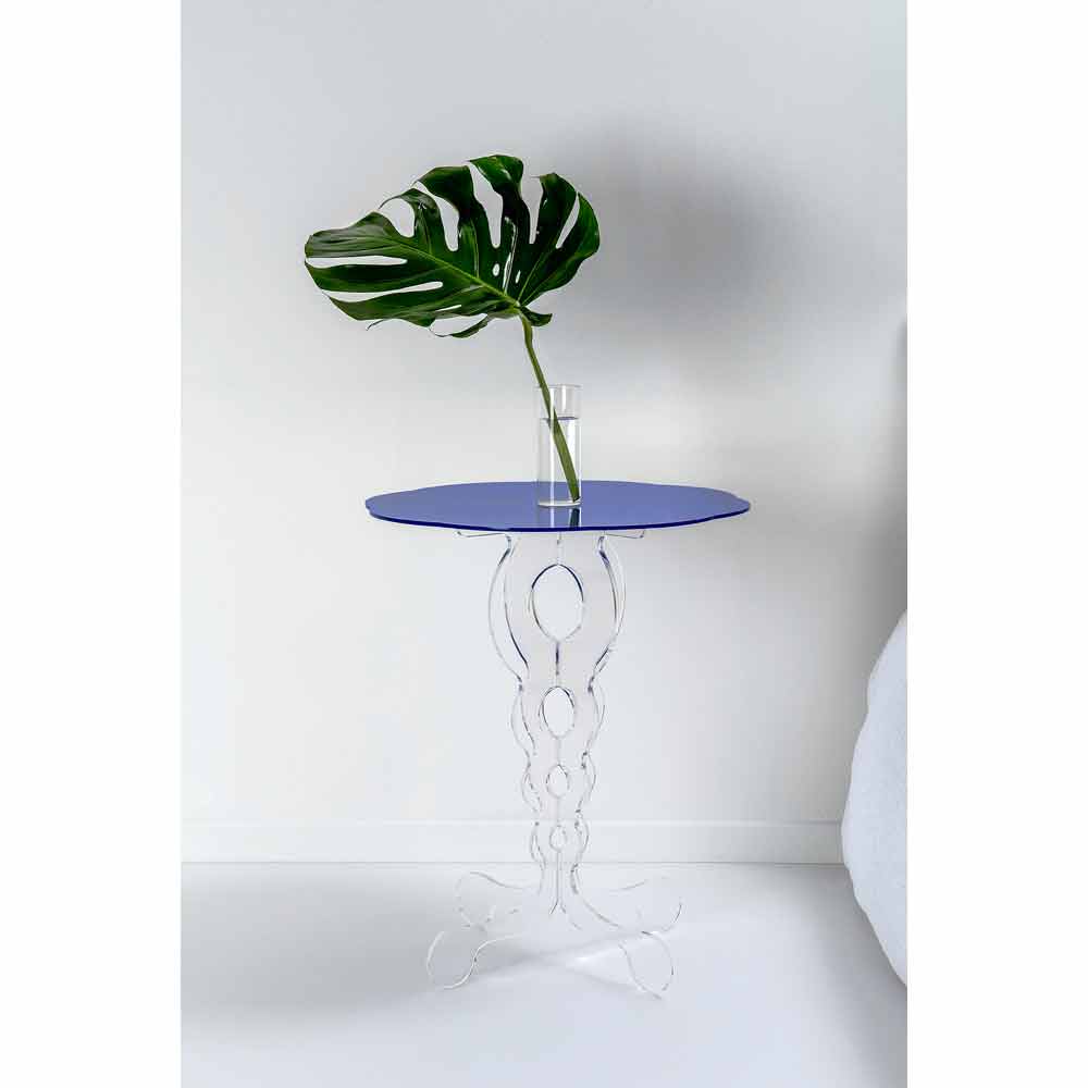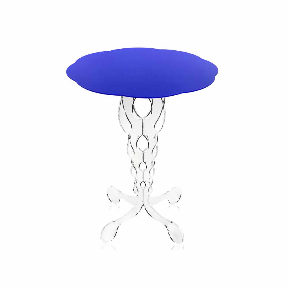 Mesa redonda pequeña azul diámetro 50 cm diseño moderno Janis, made in Italy Recuerdos árabes para la mesa azul de Janis: la base de plexiglás 100% PMMA de polímero virgen transparente, cortado con láser, otorga discreción, mientras que el estante azul con pigmento completo le da un toque de color al entorno hogareño. El plexiglás es a prueba de golpes, indeformable, inalterable y aislante del calor. El brillo y el brillo se mantienen constantes y sin cambios a lo largo del tiempo. El plexiglás de PMMA de polímero virgen utilizado es no tóxico, hipoalergénico, inodoro y antibacteriano. Diseñado, diseñado y fabricado en Italia, con materiales italianos.