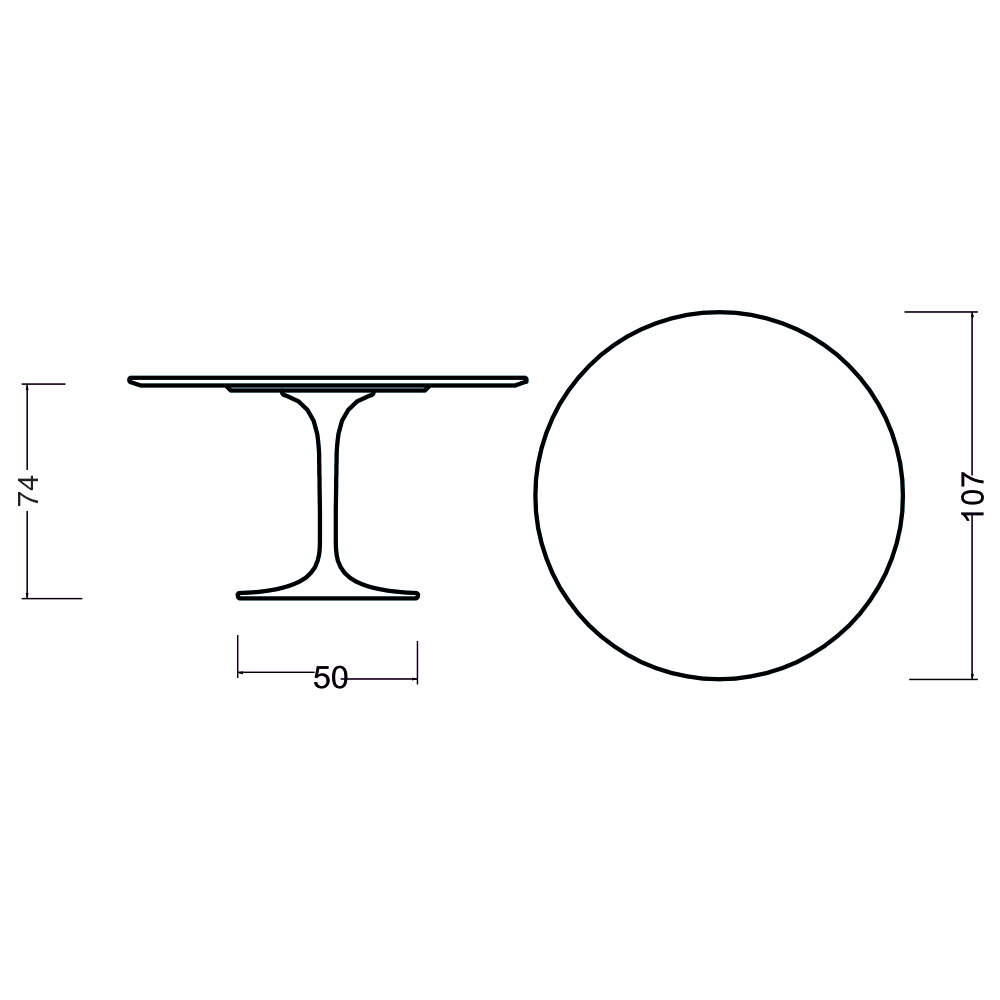 Diámetro del tablero 107 x altura 74 cm / Diámetro de la base 50 cm