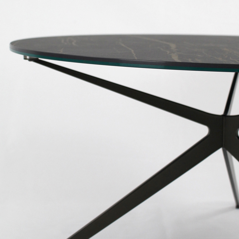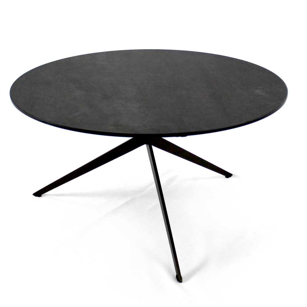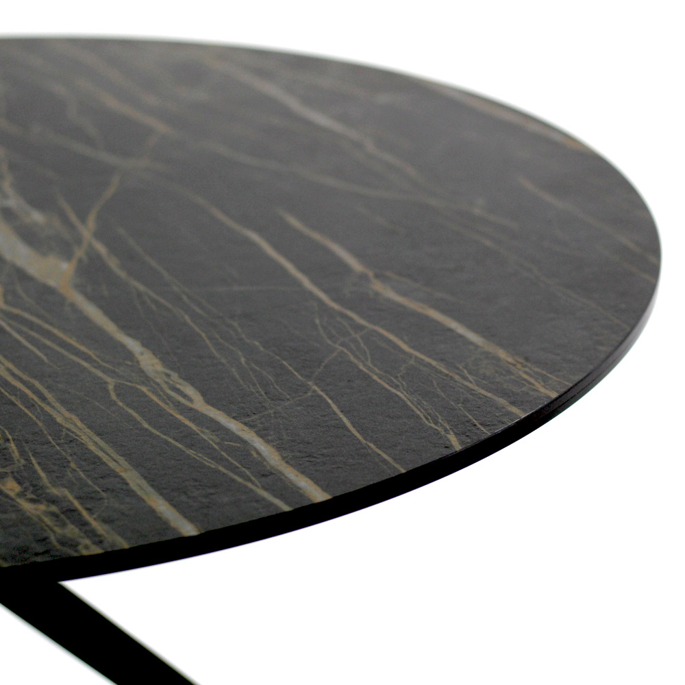 Mesita redonda con base de acero pintado y encimera de gres porcelánico.