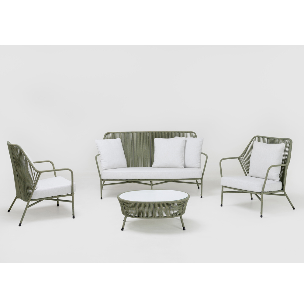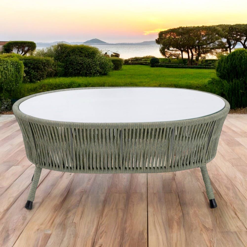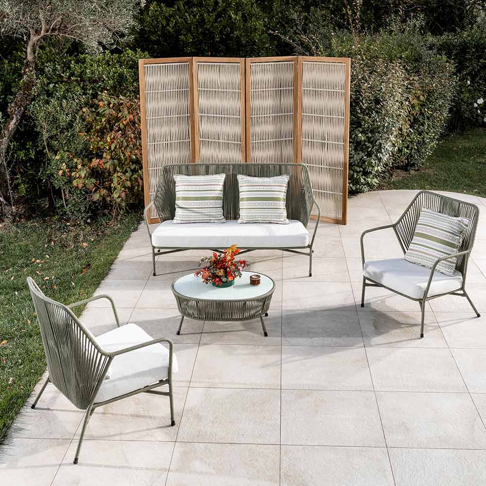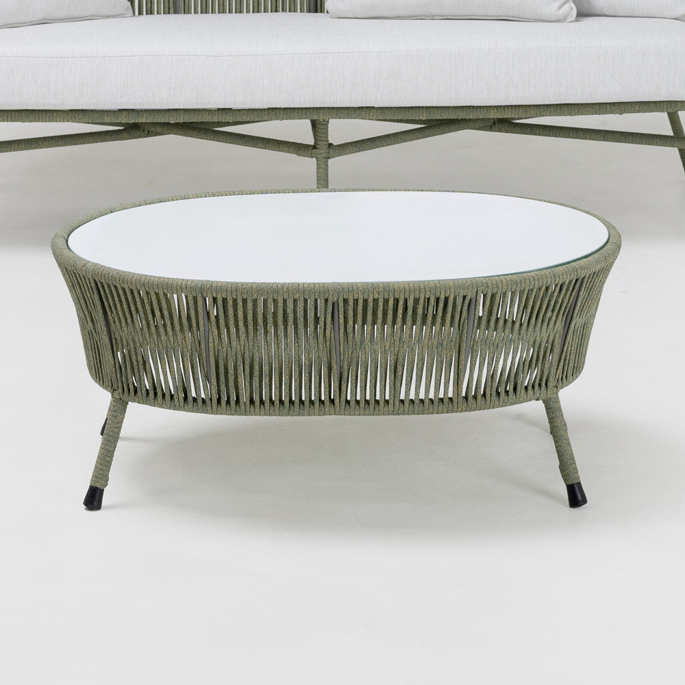 Mesa de centro de exterior fabricada con estructura de aluminio acabado desert mix, tejido de cuerda ROPE+ acabado desert mix y tapa de cristal.