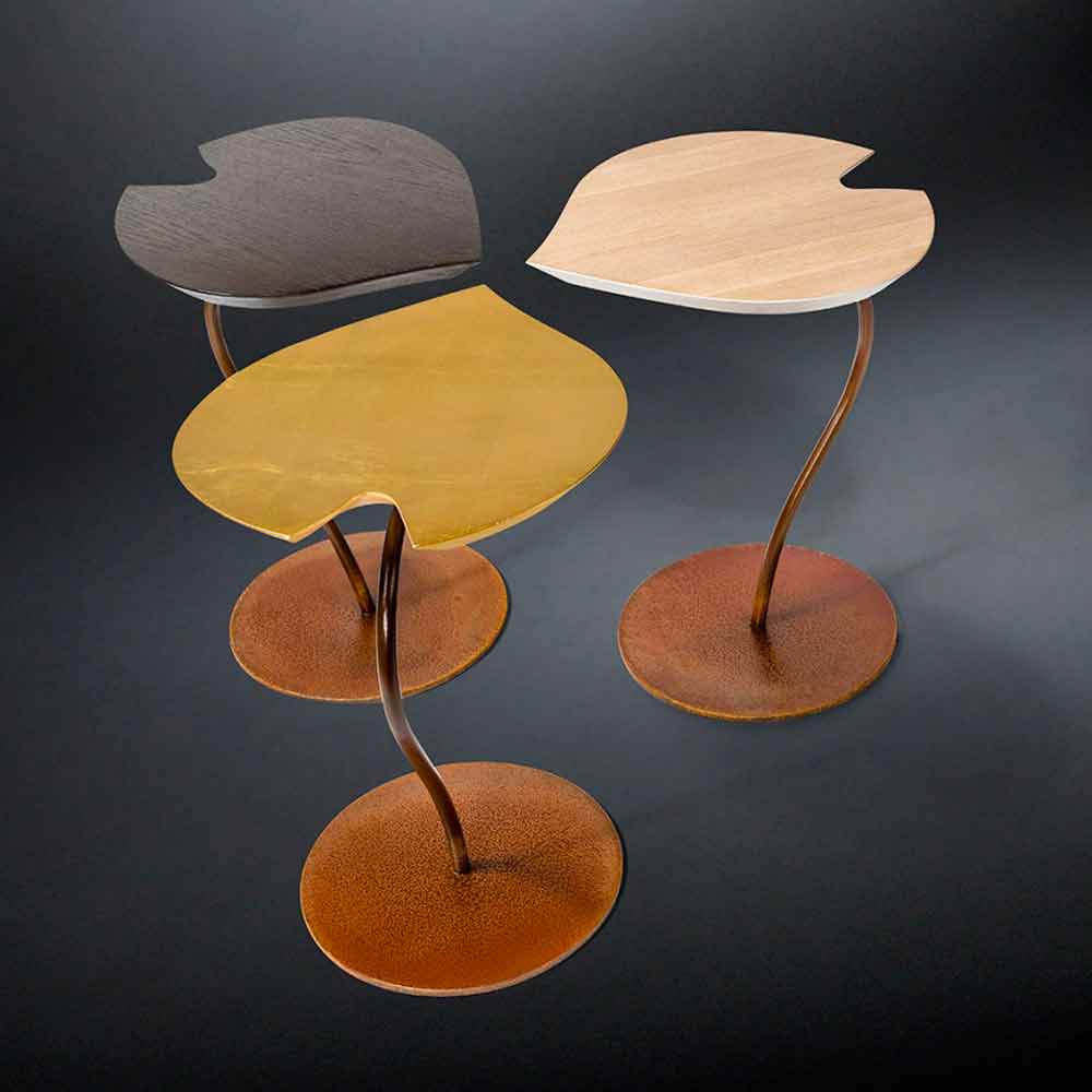 Leaf es una mesita, más bien una verdadera escultura, robusta, refinada y elegante, de diseño original y moderno en forma de hoja, adaptable a todo tipo de mobiliario. Su forma original, que mucho se parece a un pétalo o a una hoja, otorga un toque de creatividad a todos los espacios en los que se introduce. Enteramente realizada en Italia, Leaf presenta un design único e inimitable; la peculiaridad esencial consiste en su tablero de MDF contrachapado, disponible en tres acabados diferentes: roble natural a poro abierto blanqueado, roble cepillado a poro abierto color wenge-moka, hojas de madera doradas. Leaf consta de una base de metal pintado efecto corten y lleva consigo la unicidad de su design. Disponible en diferentes acabados.