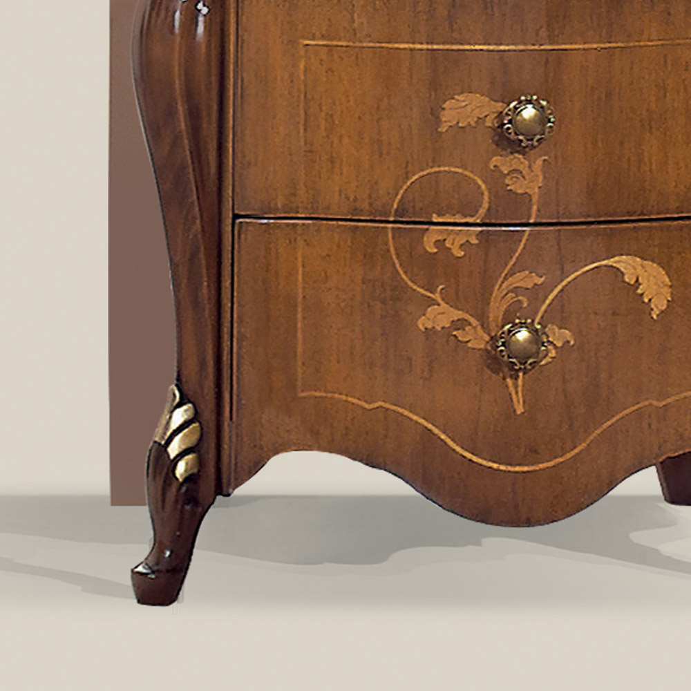 Mesita de noche para dormitorio realizada en nogal Bassano y oro antiguo con elegantes incrustaciones y 3 prácticos cajones.Un complemento único y refinado, realizado íntegramente en Italia por expertos maestros artesanos , maestros del arte que terminan cada complemento con sabiduría y gusto por la elegancia. La producción se lleva a cabo utilizando materiales nobles y realizando el trabajoamano con el máximo cuidado y profesionalismo que distingue a los productos Made in Italy .