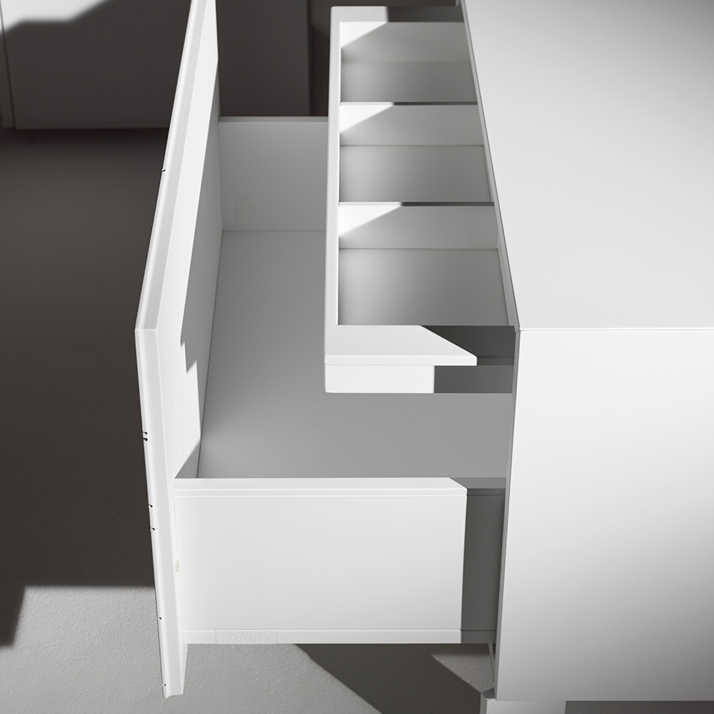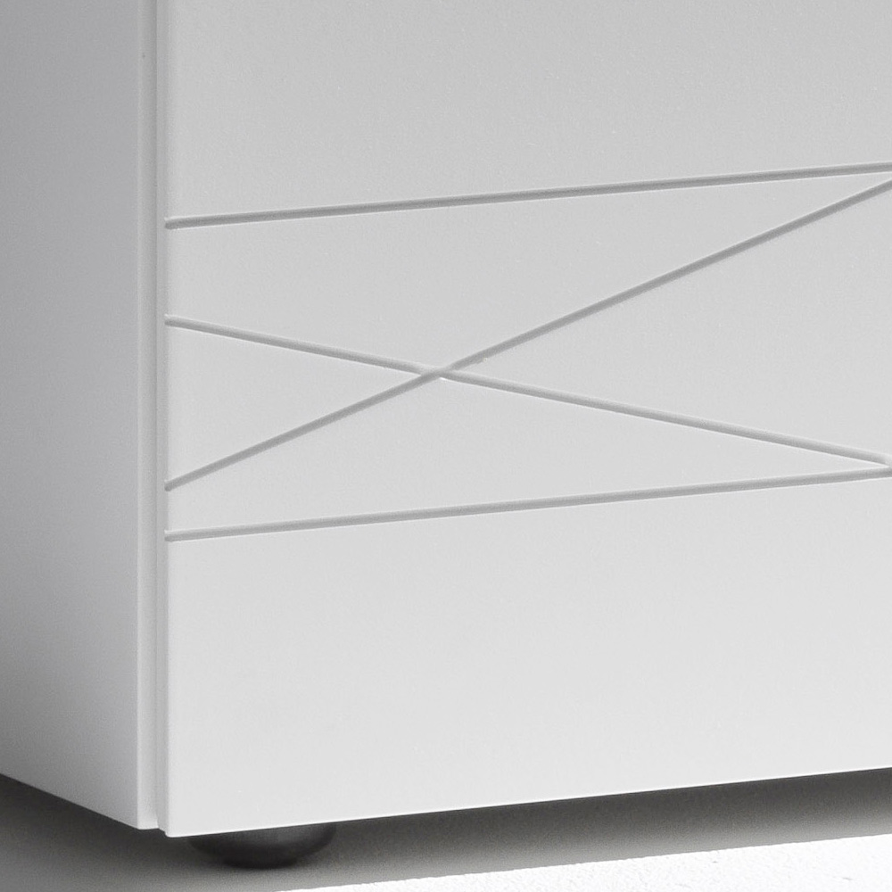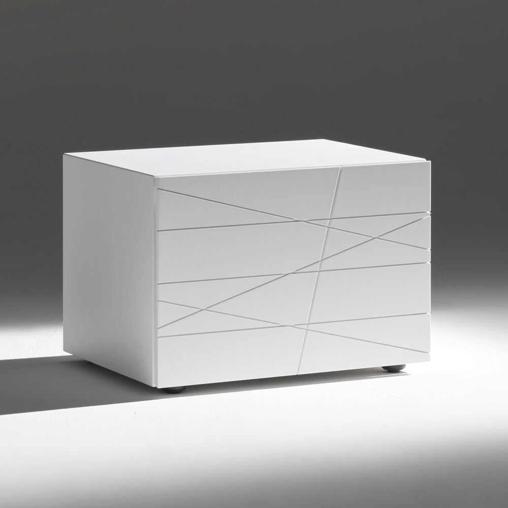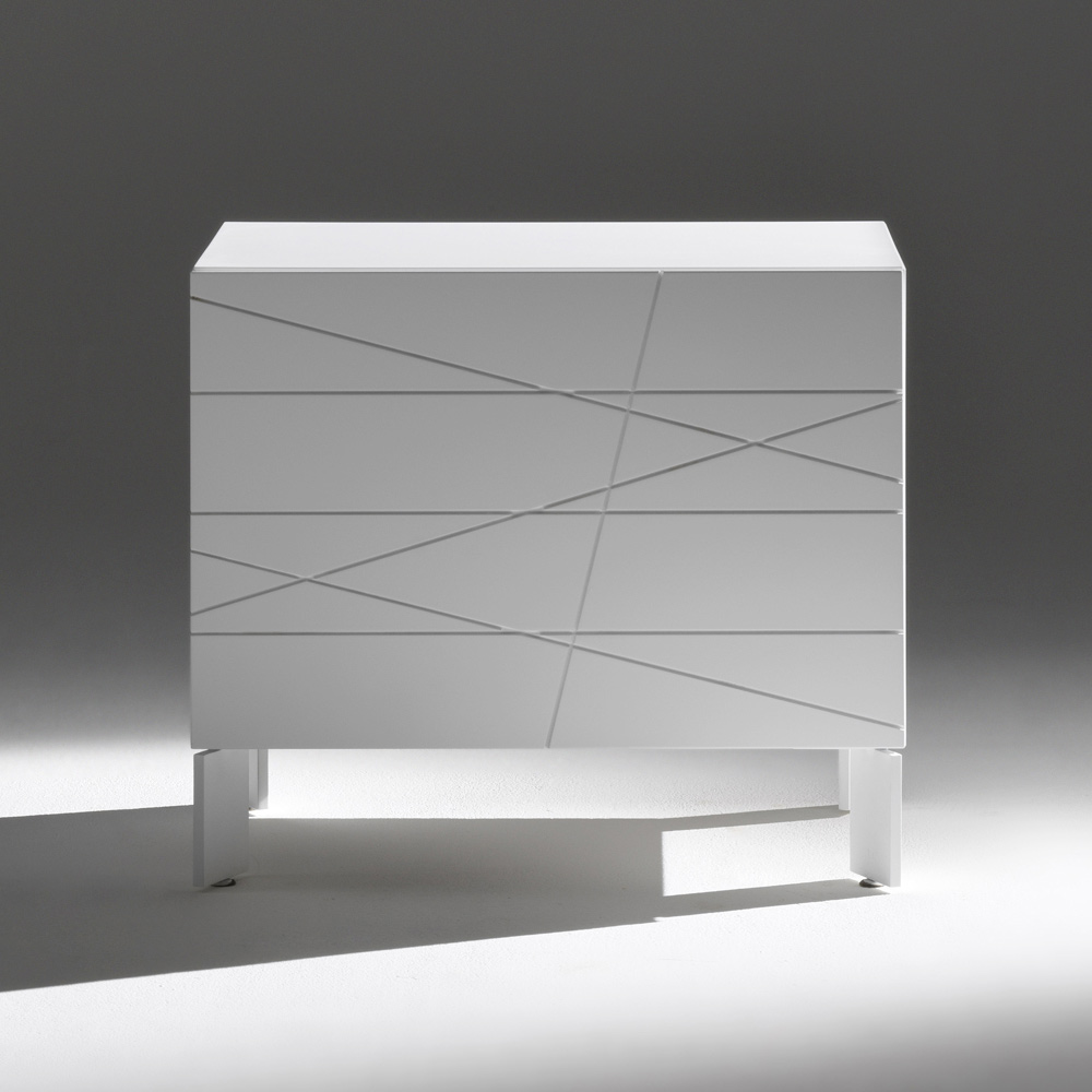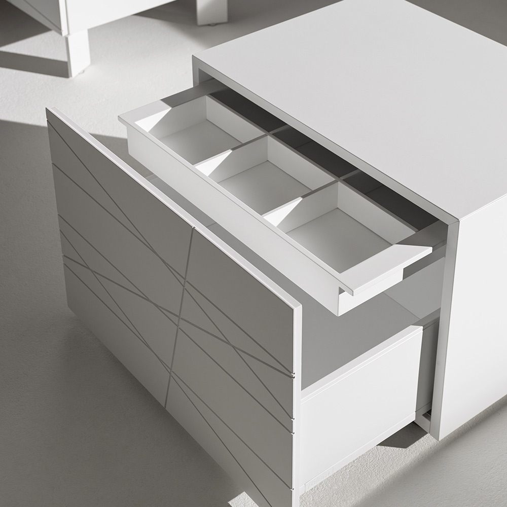 La estructura está hecha de aglomerado pintado , mientras que el frente del cajón de MDF está acabado con pinturas de poliuretano , lo que garantiza una superficie duradera, uniforme y de alta calidad. El diseño grabado en el frente crea un refinado efecto gráfico, dotando a la pieza de personalidad sin sobrecargar sus líneas.