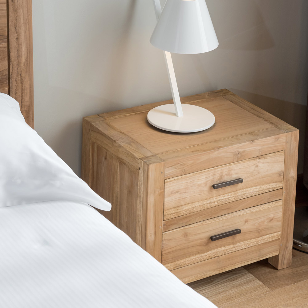 Esta mesita de noche de teca maciza es un mueble compacto y elegante, ideal para completar tu dormitorio con un estilo natural y atemporal. Su artesanía y las vetas naturales de la madera le confieren un aspecto cálido y auténtico.