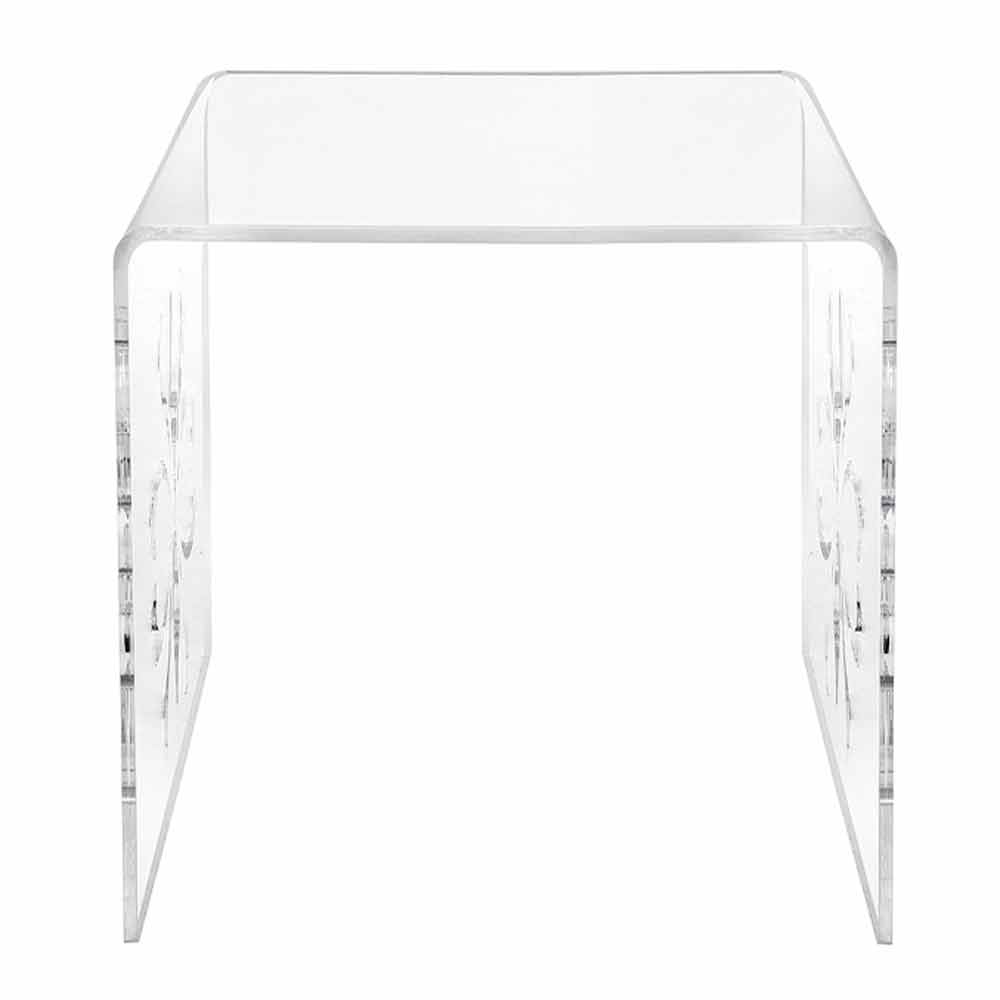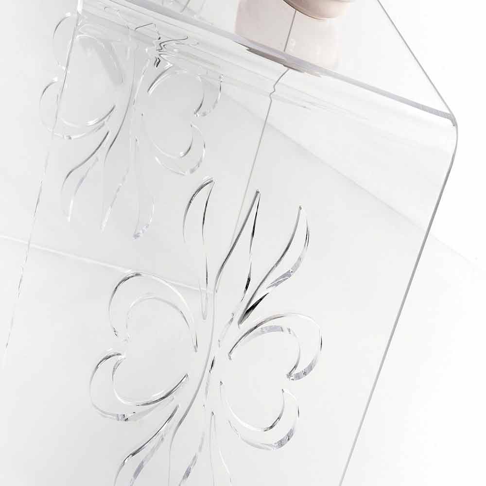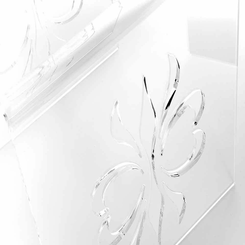 Mesita de salón de plexiglás transparente, Mandas. Mandas es una pequeña mesa hecha con el cristal acrílico más puro, adornada con incrustaciones laterales, realizadas con habilidad con la precisión del corte láser. La alta calidad del material y el grosor de la mesa realzan su brillo. Ideal para colocar frente a su sofá, es una presencia discreta y refinada en cualquier espacio, tanto clásico como moderno. Su brillo y brillo se mantienen inalterados e inalterados a lo largo del tiempo. El plexiglás PMMA utilizado de polímero virgen es no tóxico, hipoalergénico, inodoro y antibacteriano. 100% reciclable. Pensado, diseñado y fabricado en Italia con materiales italianos.