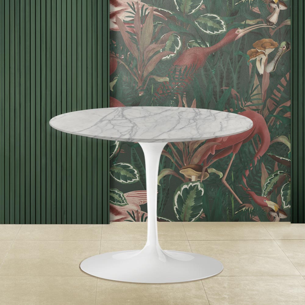 Mesa de centro redonda con tapa de mármol statuarietto de carrara y base de aluminio pulido fabricada en Italia