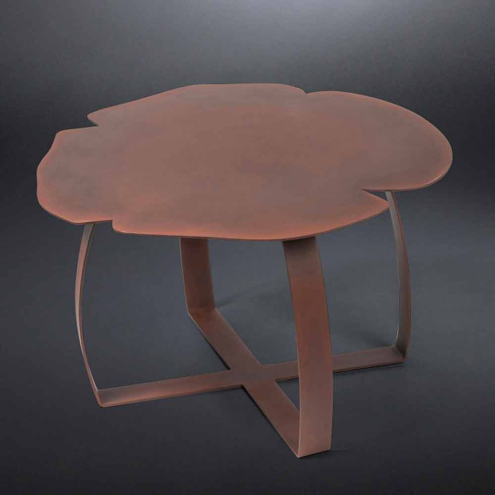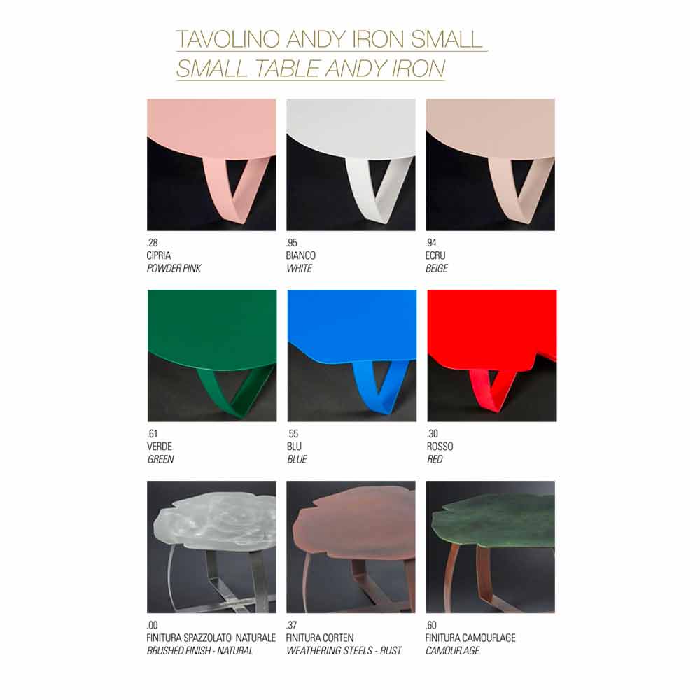 Andy es una mesita de servicio robusta, sencilla y elegante a la vez, de diseño original y moderno, adaptable a todo tipo de mobiliario. Mesita de café con forma original de flor, sencilla y estilizada, caracterizada por línea actuales y juveniles, que otorgan un toque de creatividad a todos los espacios en los que se introduce. Mesita de diseño único e inimitable, su peculiaridad esencial reside en el material empleado, o sea metal tallado con láser en forma de flor con base de metal arqueado del mismo color del tablero, hecha excepción por el acabado en camuflaje. El barnizado epoxídico de alta resistencia está disponible en tonalidades diferentes.