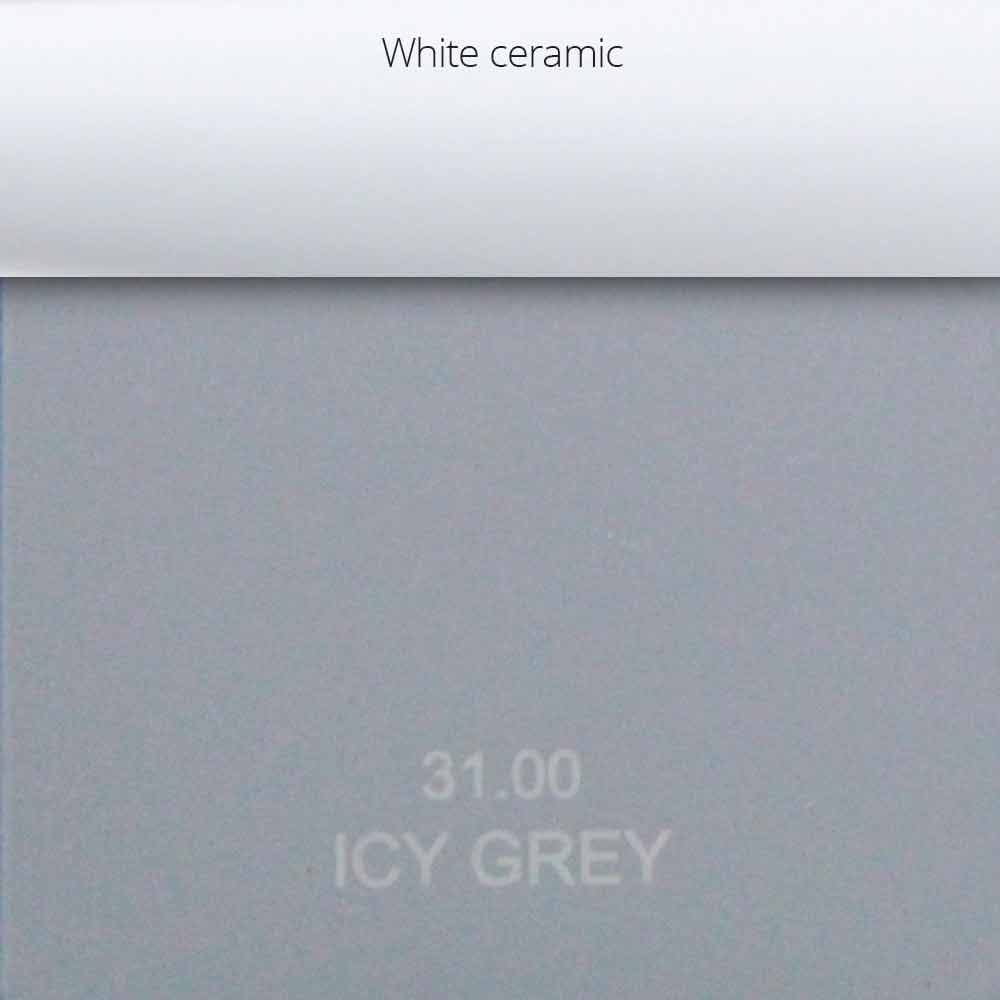 Icy Grey: acabado gris claro frío mate con inserciones de cerámica blanca en los tiradores;