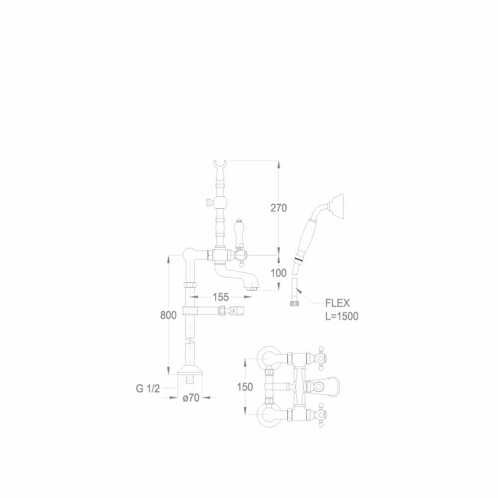 Mezclador de bañera expuesto en columnas de suelo con desviador y teleducha dúplex Made in Italy.