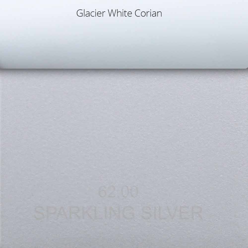 Sparkling Silver + Glacier White Corian®: acabado metálico plateado mate con elementos DuPont ™ Corian® blancos;
