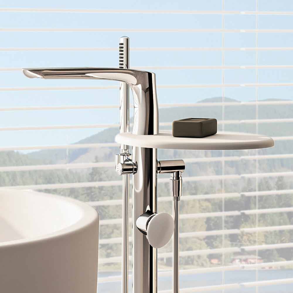 Este mezclador está instalado en el suelo, equipado con un rompe chorros; Sistema con boquillas anti-cal Fast & Easy Clean para eliminar la cal con un simple gesto de la mano y cartucho de disco de cerámica .