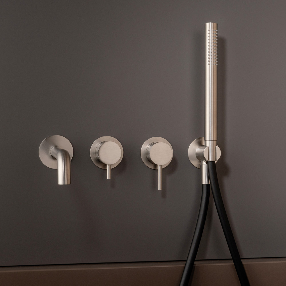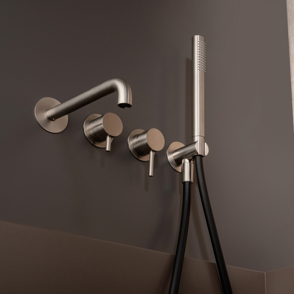 Mezclador de bañera empotrado con palanca desviadora y caño, con kit de ducha fabricado en acero inoxidable AISI 316L , material 100% reciclable, íntegramente Made in Italy.