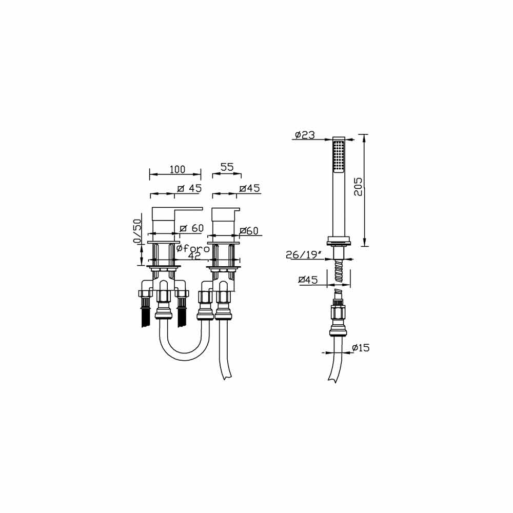 Mezclador de borde para bañera cromado de 3 orificios sin caño y con kit de ducha. Fabricado íntegramente en Italia en latón ; con materiales de alta calidad cumpliendo con las normas europeas.