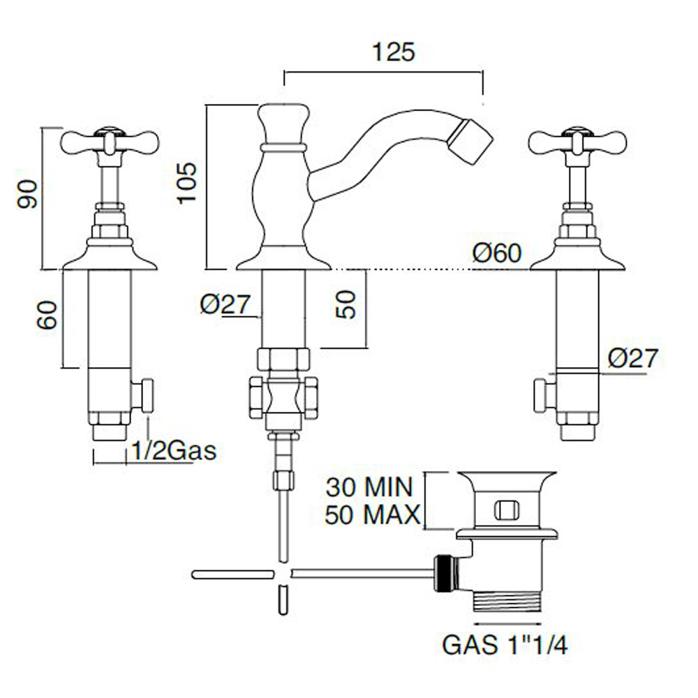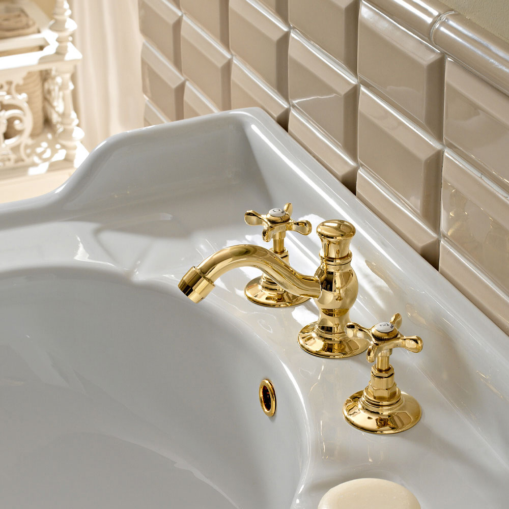 Grifo clásico para lavabo de 3 orificios de latón artesanal fabricado en Italia.
